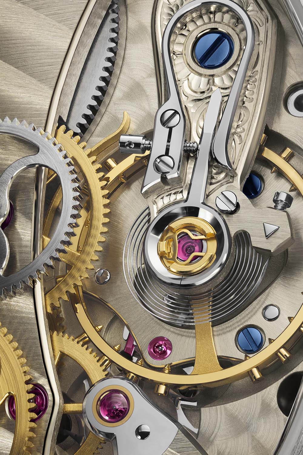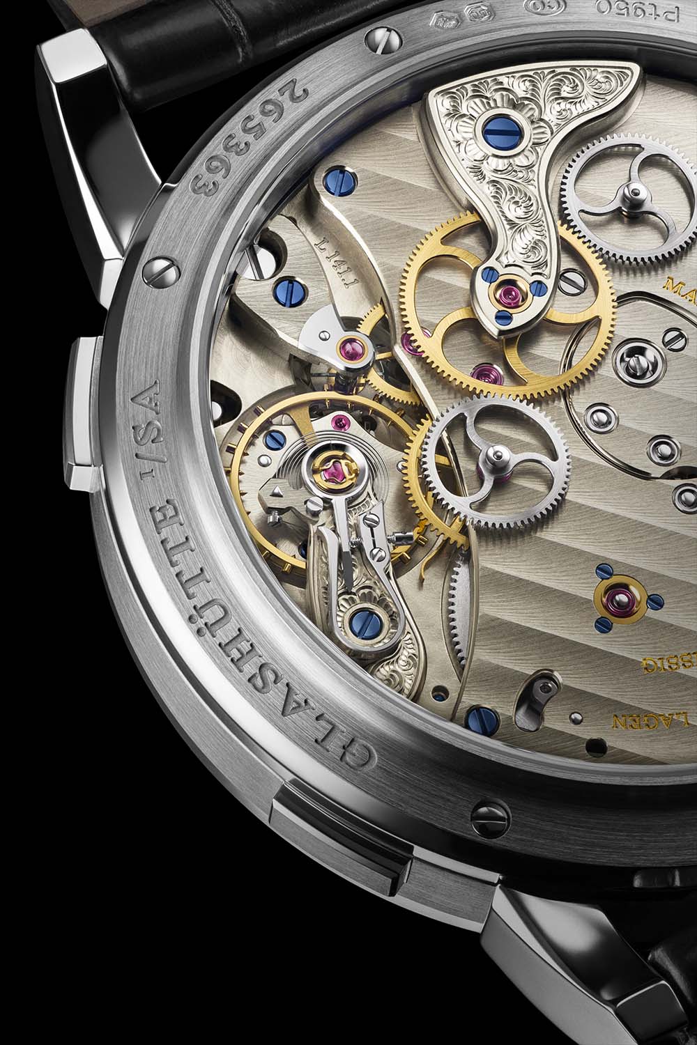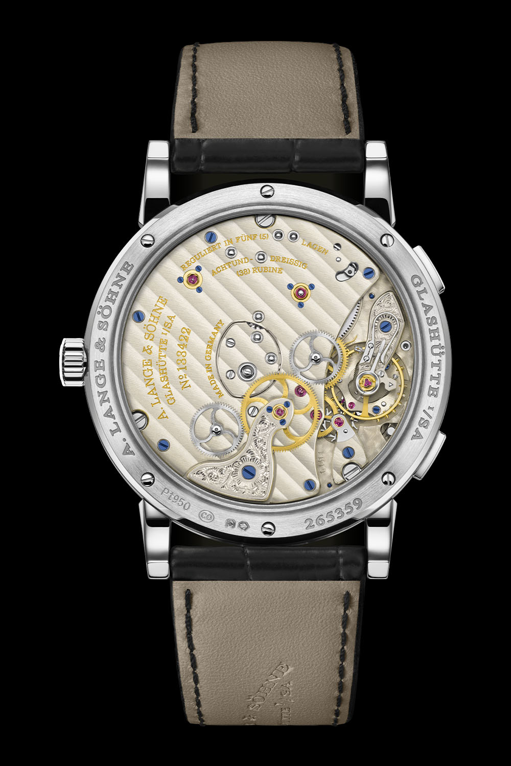 Like the 2020 editions, this platinum Lange 1 Time Zone is powered by manufacture calibre L141.1. This manual-winding calibre retains the formidable 3-day power reserve of the first 2005 editions but is now on a single mainspring barrel. Fitted with a lever escapement, the movement has 448 parts and measures 34.1mm x 6.7mm. Finishings are in line with Lange’s Saxon heritage and include the classic three-quarter untreated German silver plate decorated with ribbing; the screwed gold chatons; the blued screws; the chamfered, bevelled and polished edges; the mirror-polished whiplash spring; the polished internal angles; and the hand-engraved floral pattern on the balance cock.