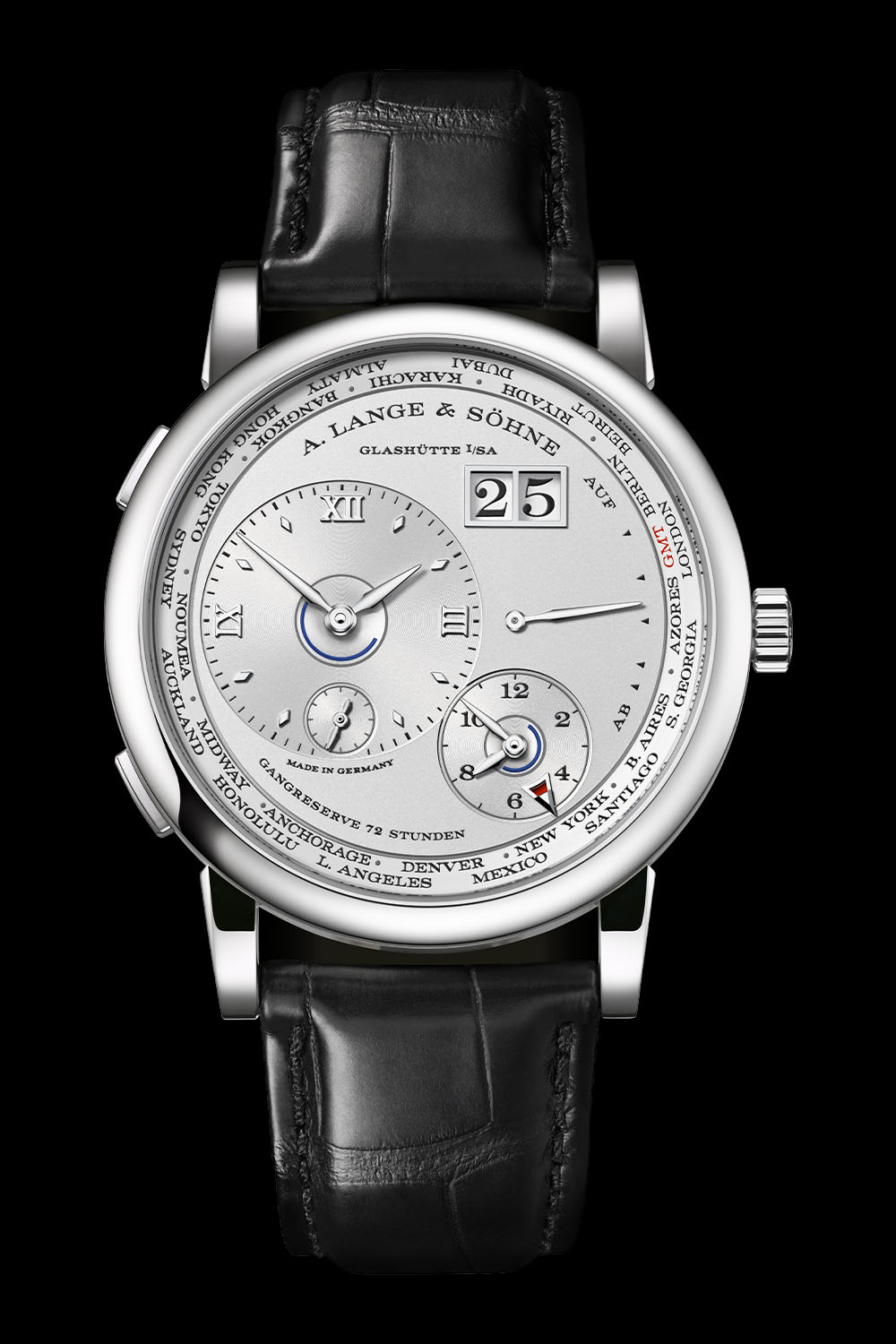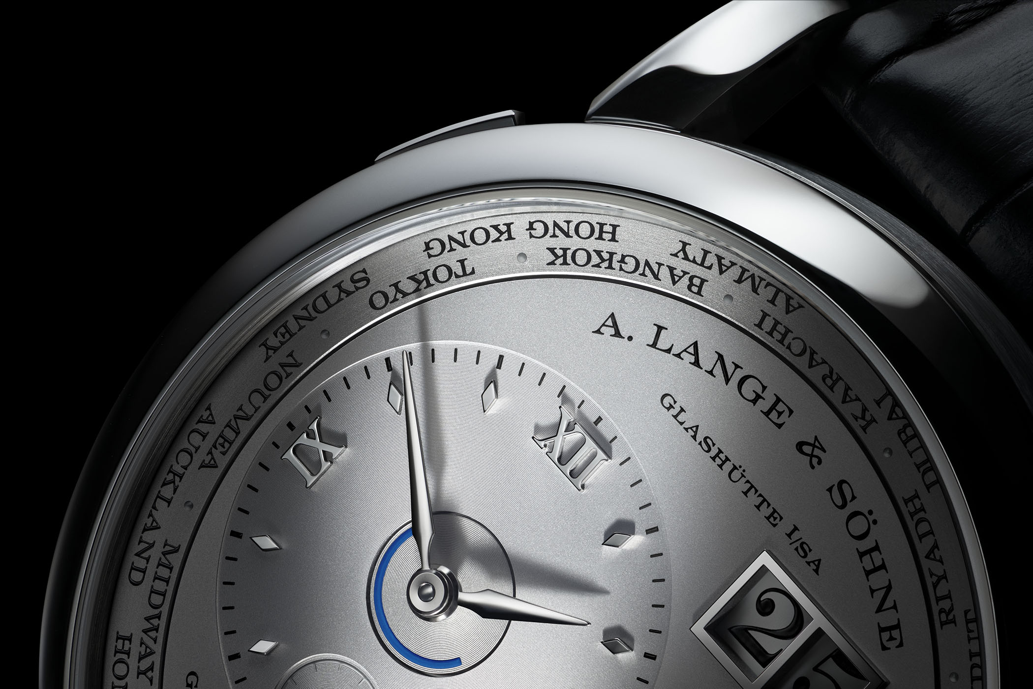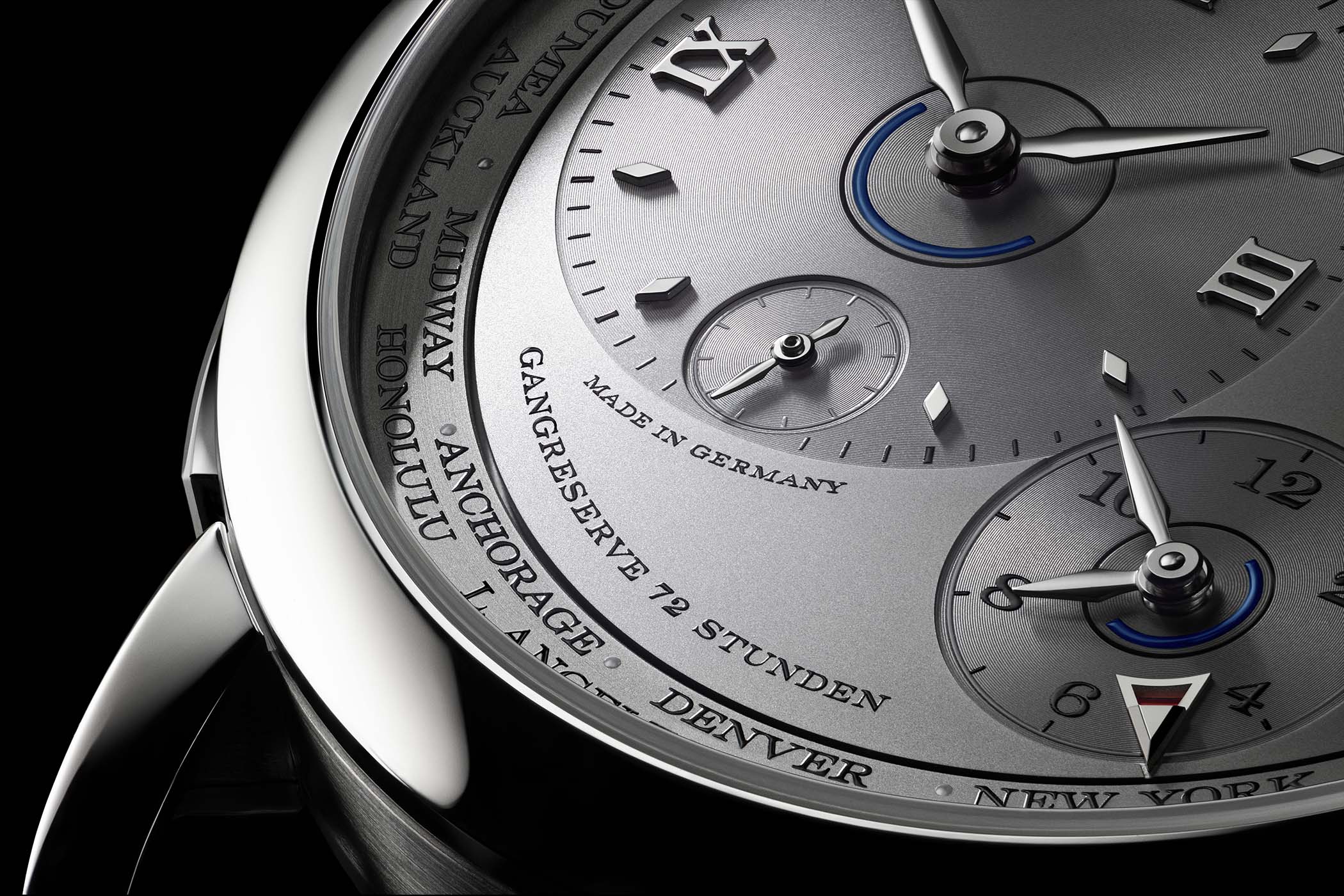 But how do you know if it’s night or day? Lange also considered this and devised a simple, effective solution for both time zones. Using ring-shaped indicators with a semicircular section highlighted in dark blue positioned on the central axis of both time circles, travellers can determine whether it is night or day at a glance.