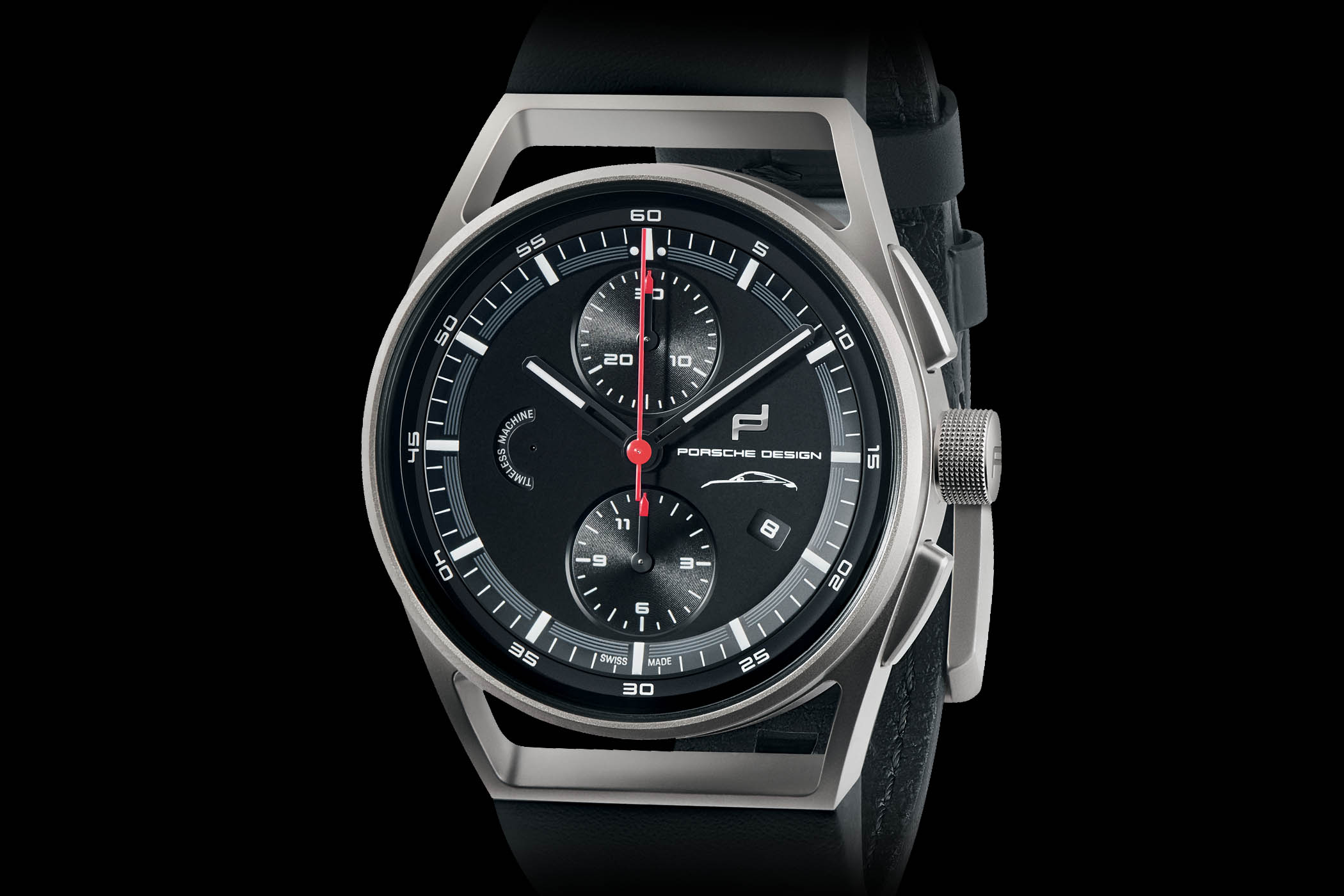 The black dial features a partial white silhouette of the Porsche 911 Codename 992 at 3 o’clock with PORSCHE DESIGN and its applied logo above. A sub-dial with the words TIMELESS MACHINE sits at 9 o’clock – this sub-dial is actually the running seconds, and the words are moving – while the chronograph counters are at 12 and 6 o’clock. The sub-dial hands are black with red tips, while the central seconds hand is bright red. The sub-dials and their respective hands are designed to resemble speedometers, and the bottom one cleverly has an 11 printed instead of 12, displaying it after the 9 to show 911. The hour and minute hands are black with white inserts, and the outer white minute track has a gradually fading grey stripe between the 10 to 35-second marks. An angled date window sits at 4 o’clock with the background and print matching the dial.
