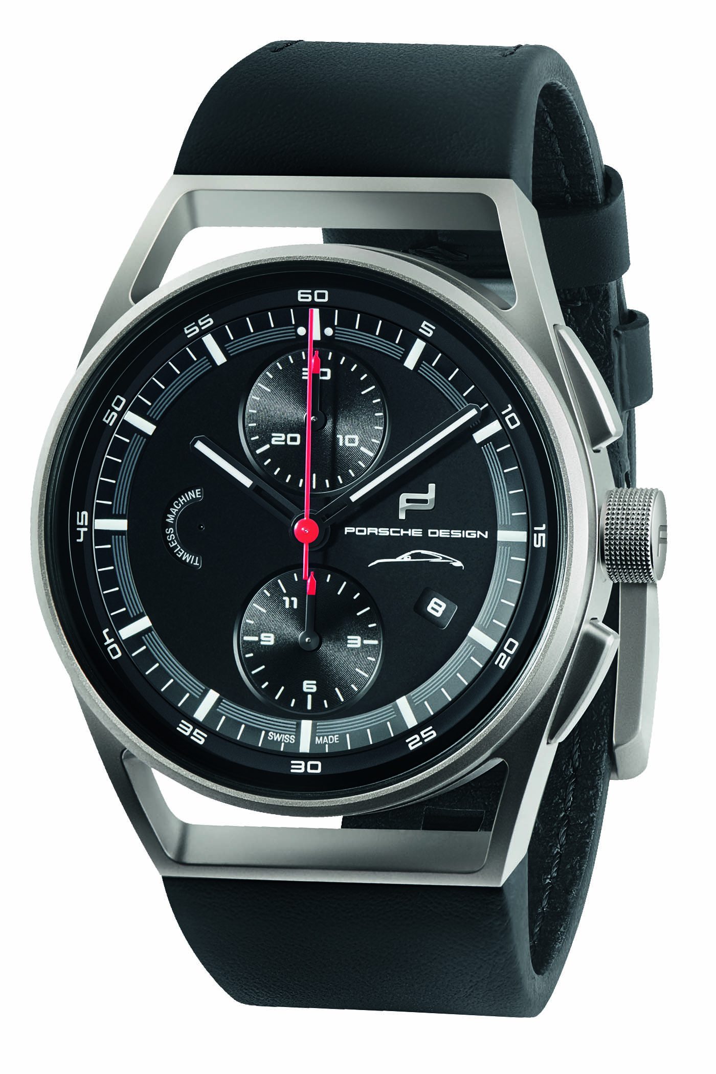 The black dial features a partial white silhouette of the Porsche 911 Codename 992 at 3 o’clock with PORSCHE DESIGN and its applied logo above. A sub-dial with the words TIMELESS MACHINE sits at 9 o’clock – this sub-dial is actually the running seconds, and the words are moving – while the chronograph counters are at 12 and 6 o’clock. The sub-dial hands are black with red tips, while the central seconds hand is bright red. The sub-dials and their respective hands are designed to resemble speedometers, and the bottom one cleverly has an 11 printed instead of 12, displaying it after the 9 to show 911. The hour and minute hands are black with white inserts, and the outer white minute track has a gradually fading grey stripe between the 10 to 35-second marks. An angled date window sits at 4 o’clock with the background and print matching the dial.