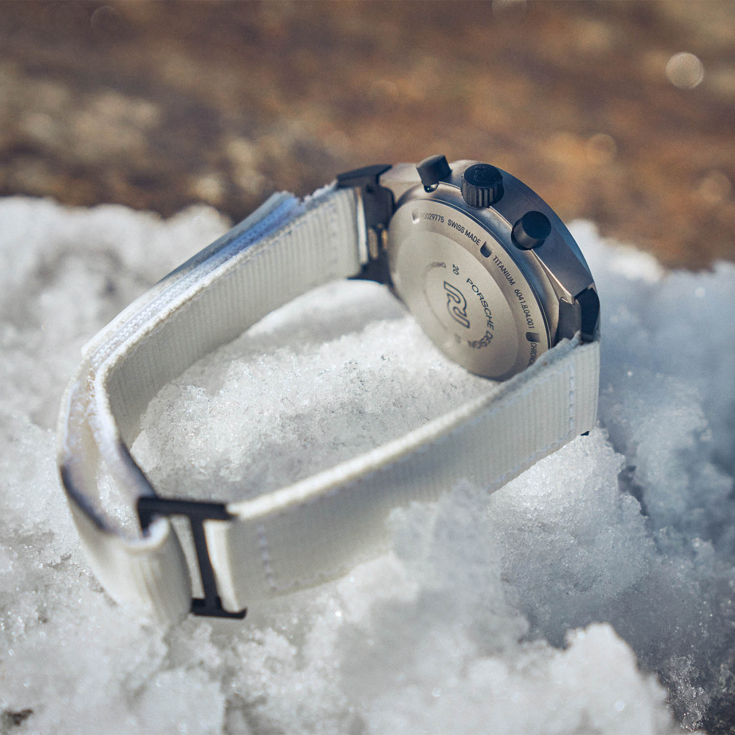 The GP 2023 Limited Edition is introduced with two strap variants. The white GP fabric strap, previously offered with the GP 2022 Edition, is designed to be worn over a ski or racing suit – the brand suggests that skijoring enthusiasts will appreciate it. Porsche Design will supply a classic black leather strap with a matte-black titanium folding clasp for those not up to the ultimate winter courage test. In the past, the skiers were pulled across the ice track by horses; the Zell am See event implicates pulling by race cars, a modern-day variant of skijoring.