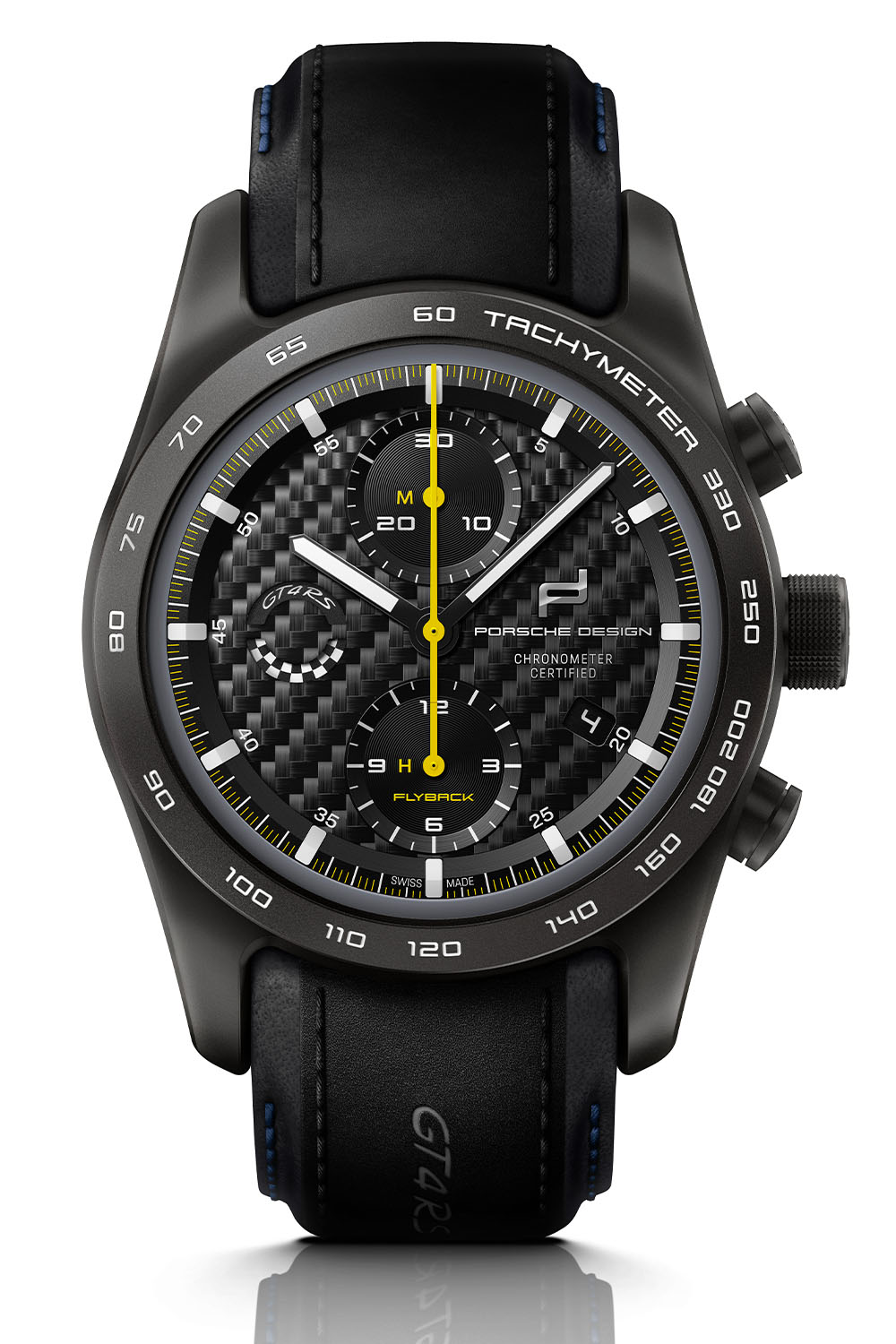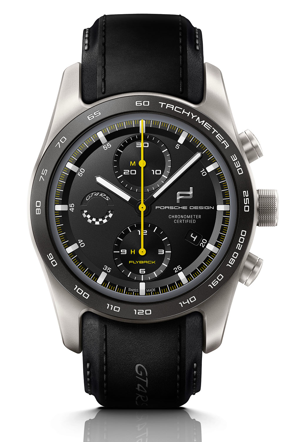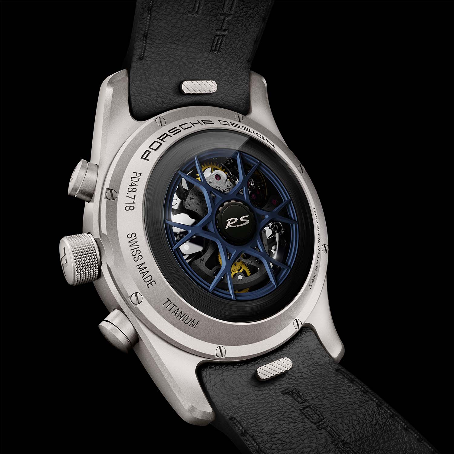 The Porsche Design Chronograph 718 Cayman GT4 RS is worn on a black leather and Race-Tex strap with embossed logo and decorative stitching in Arctic Gray or Deep Sea Blue. Additional straps/bracelets can be ordered, made either of titanium or genuine Porsche interior leather in various colors.