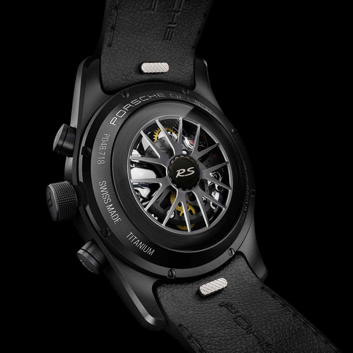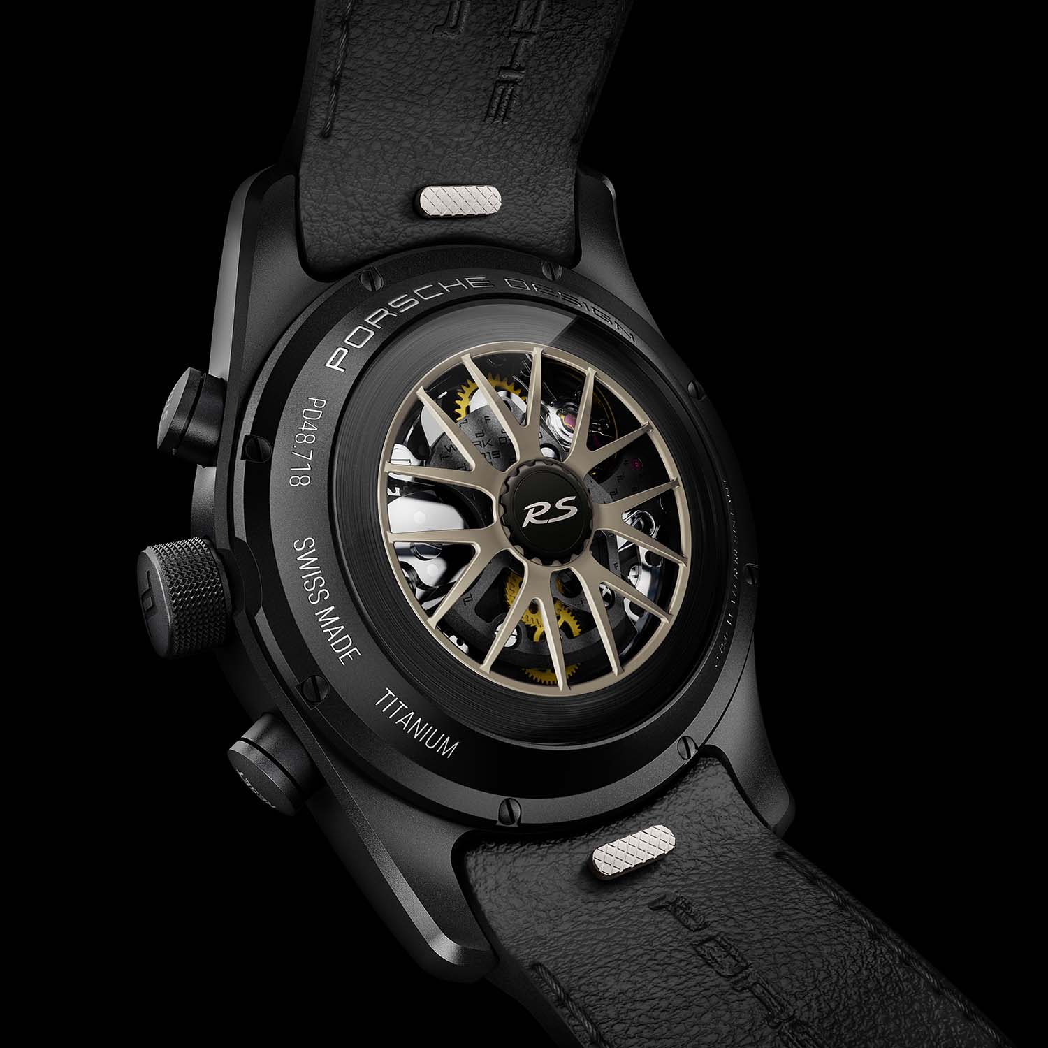 Turning the watch over, the caseback reveals the Porsche Design Caliber WERK 01.200, a proprietary flyback chronograph chronometer-certified by the COSC. As with previous models, the rotor is shaped exactly like the rims of the cars it matches. Here, you’ll find two design options (GT4 RS or Weissach), and each can be ordered in 5 or 6 different colours – which are the same as the car in question.