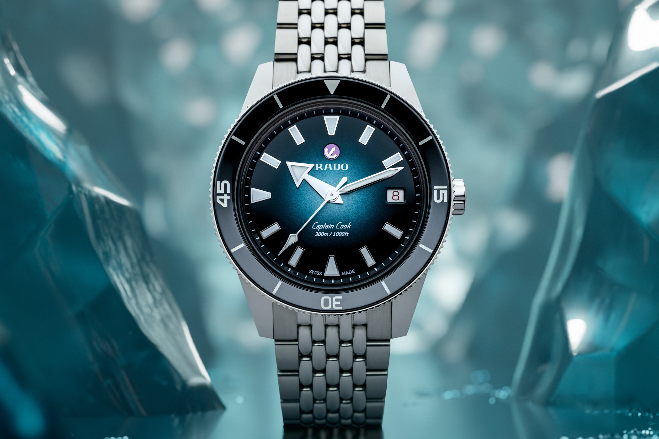It’s fair to say that genuine horological novelties, in the form of complications and new collections, have given way to a more trend-oriented approach in the watch industry. Riding the wave, many brands revisit popular collections in more compact case dimensions and different materials, treating the dials to seasonal colours. Rado’s Captain Cook, the brand’s robust water-resistant dive watch launched in 1962, has followed the formula since its resuscitation in 2017. Making hay while the summer sun shines, Rado expands its recent 39mm-sized Captain Cook with two different ceramic bezel colours and dials designed to evoke maritime adventures.