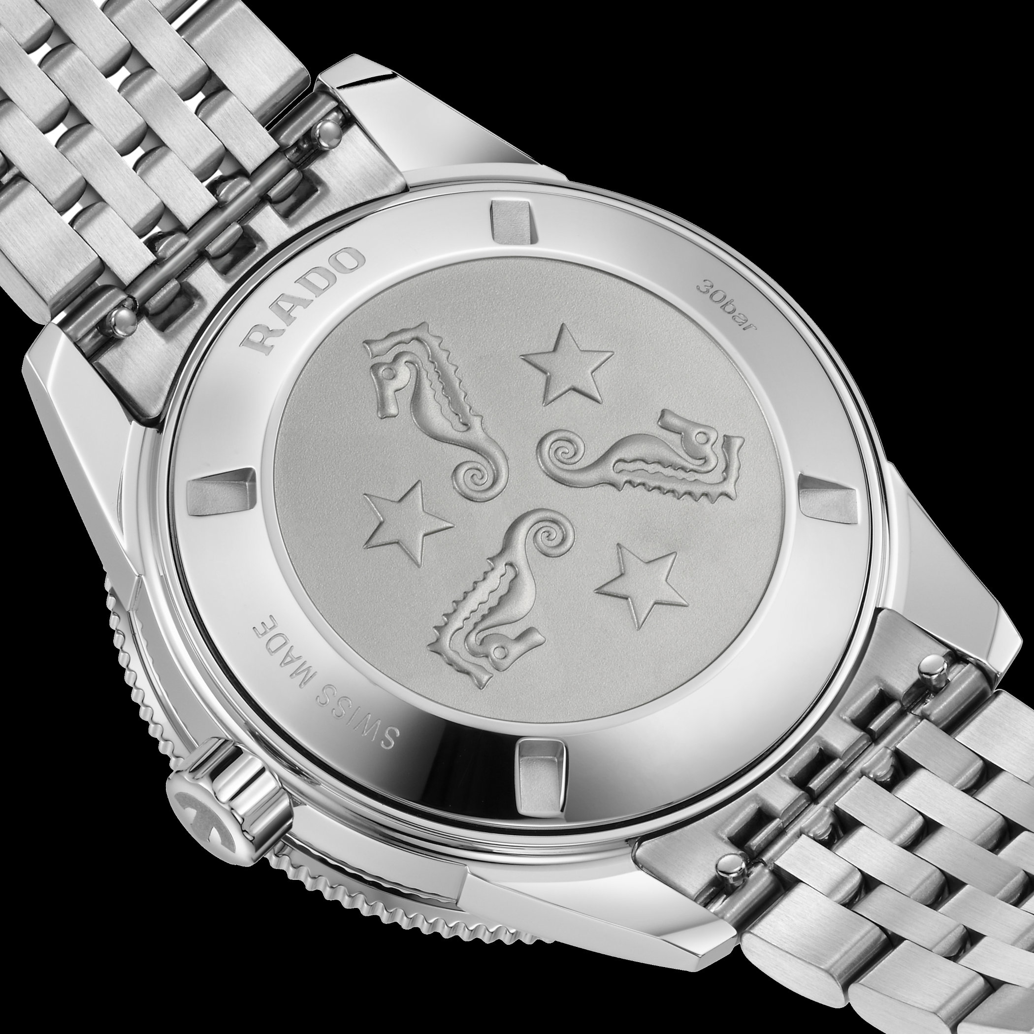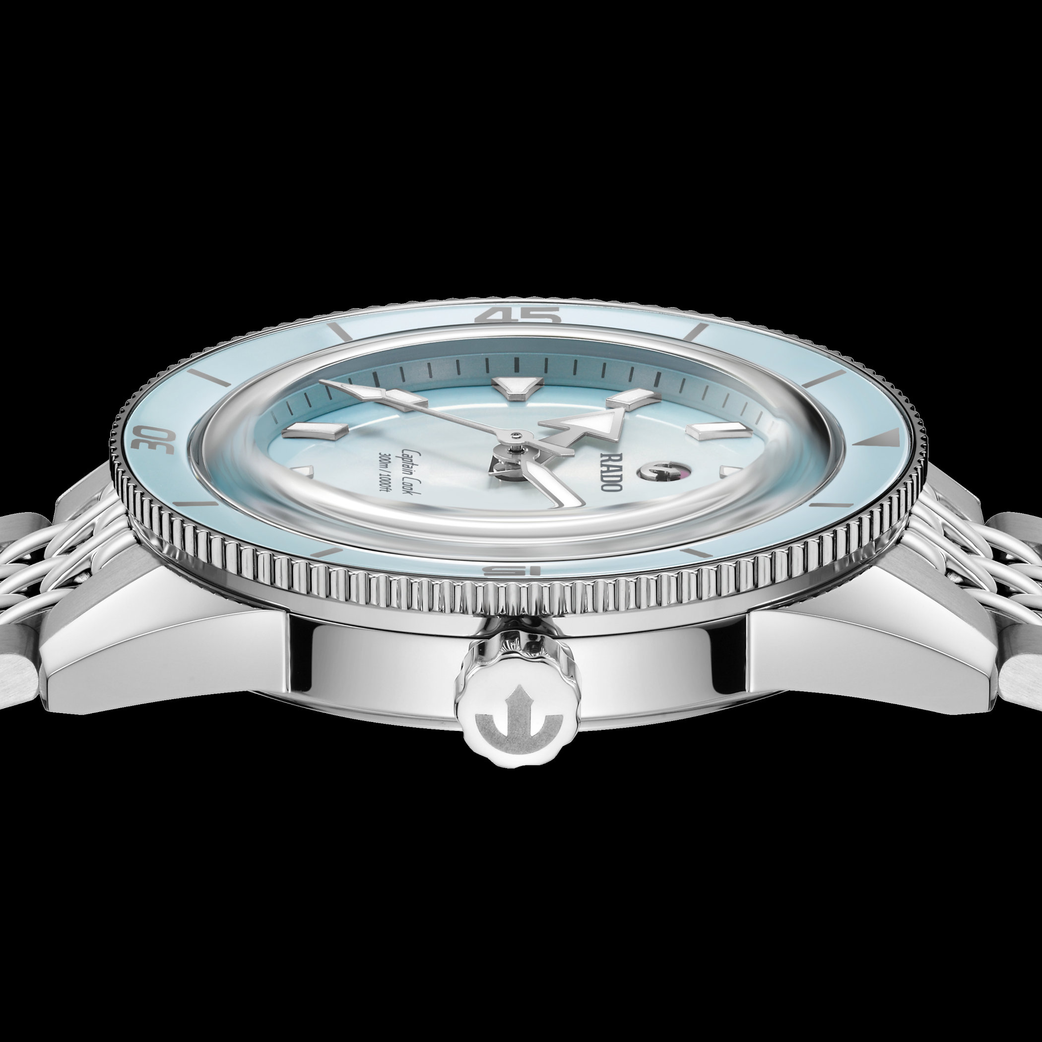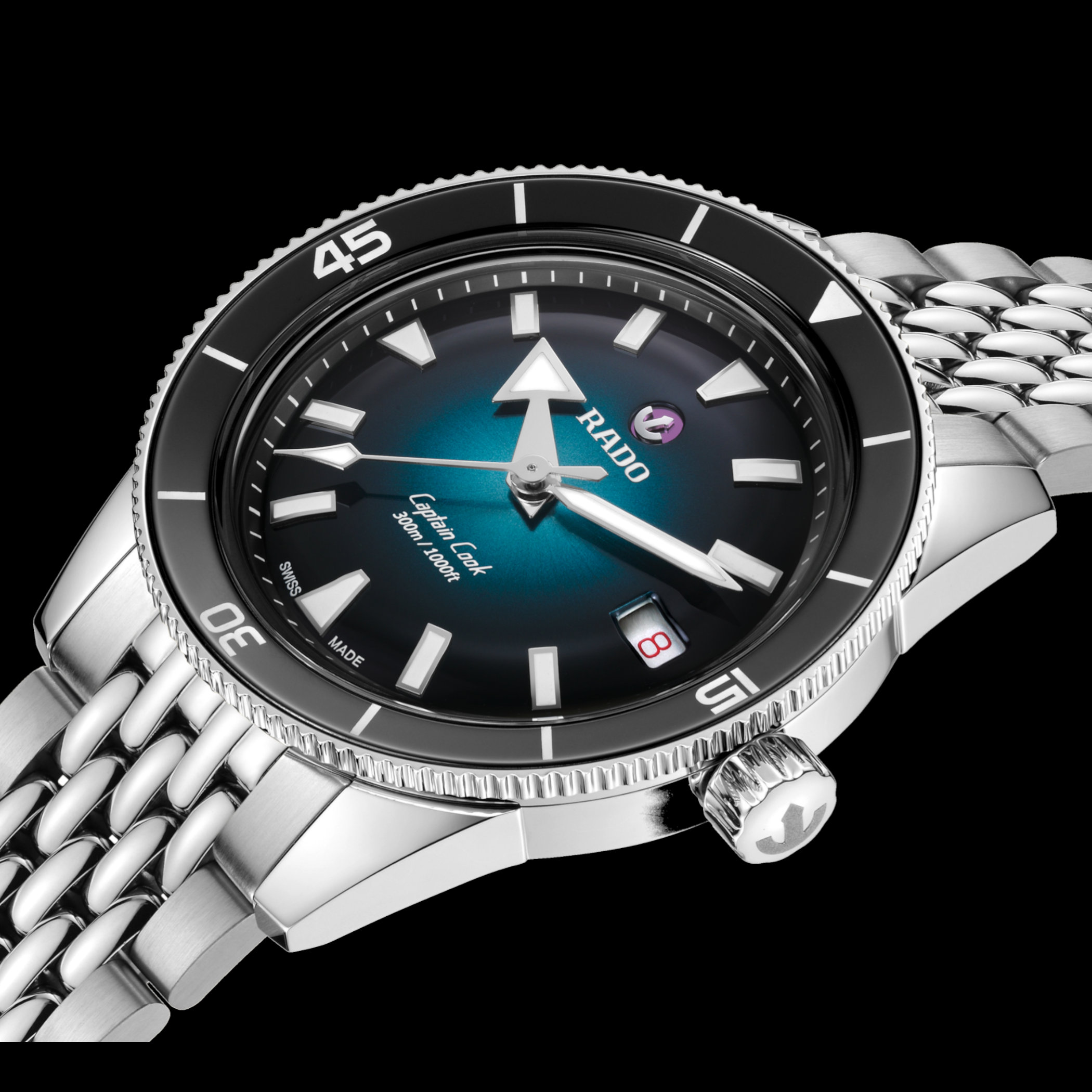 Although this is the first 39mm Captain Cook to join the permanent collection, a limited-edition Tennis model was teased just two weeks ago. Now official, the new 39mm case size sits alongside the regular 42mm and 37mm stainless steel crew members currently in the collection (the ceramic models and chronographs have larger 43mm cases). The rugged 39mm stainless steel case, measuring a fairly contained thickness of 12mm, features a screw-down crown and caseback, and can withstand depths of 300 metres. The external dive bezel features a polished high-tech ceramic insert, one of Rado’s core competencies. Available in light blue with silver metallised markings or black ceramic with white Super-LumiNova, the 120-click bezel is unidirectional. To recreate the look of the original’s acrylic glass, the dial is protected by a box-shaped sapphire crystal.