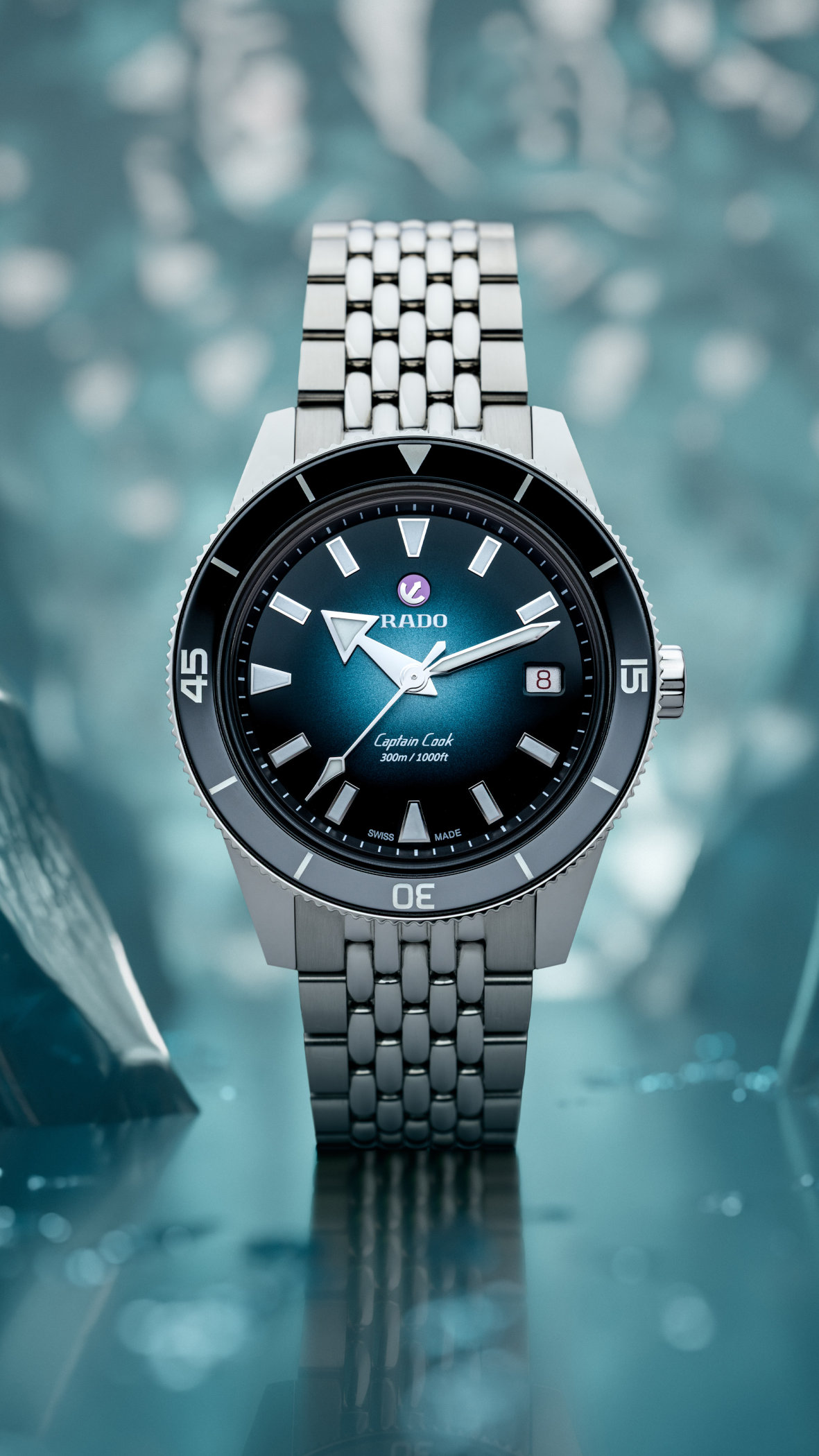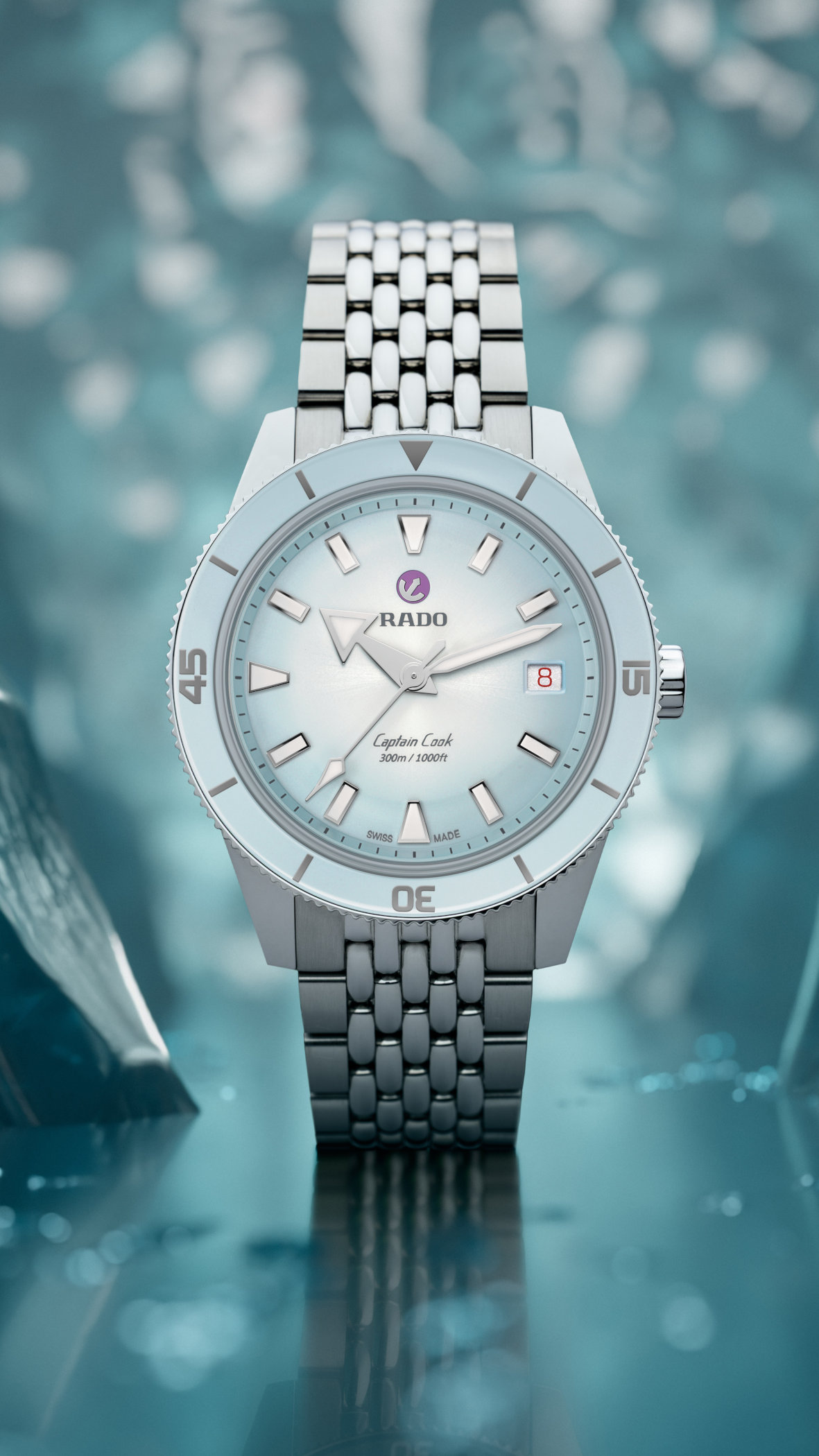 It’s fair to say that genuine horological novelties, in the form of complications and new collections, have given way to a more trend-oriented approach in the watch industry. Riding the wave, many brands revisit popular collections in more compact case dimensions and different materials, treating the dials to seasonal colours. Rado’s Captain Cook, the brand’s robust water-resistant dive watch launched in 1962, has followed the formula since its resuscitation in 2017. Making hay while the summer sun shines, Rado expands its recent 39mm-sized Captain Cook with two different ceramic bezel colours and dials designed to evoke maritime adventures.
