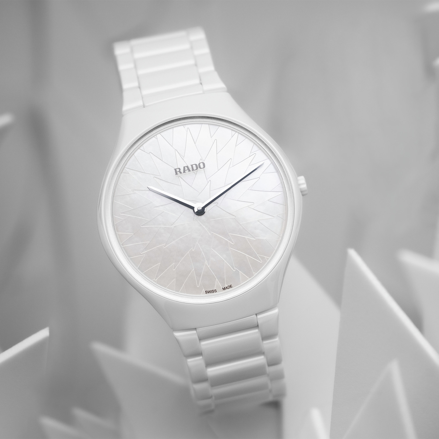 Rado is renowned for its innovative use of high-tech ceramic and minimalist, contemporary design. Although we usually cover the sportier retro-inspired members of Rado’s family on MONOCHROME, such as the Captain Cook and the Diastar, the brand also offers dressier more contemporary models like the Rado True Thinline. Introduced in 2011, this watch has an injected monobloc high-tech ceramic case construction that ensures a super-slim profile. Three new automatic models, with textured dials inspired by endangered plant species in partnership with the Great Gardens o the World organisation, join the True Thinline collection.