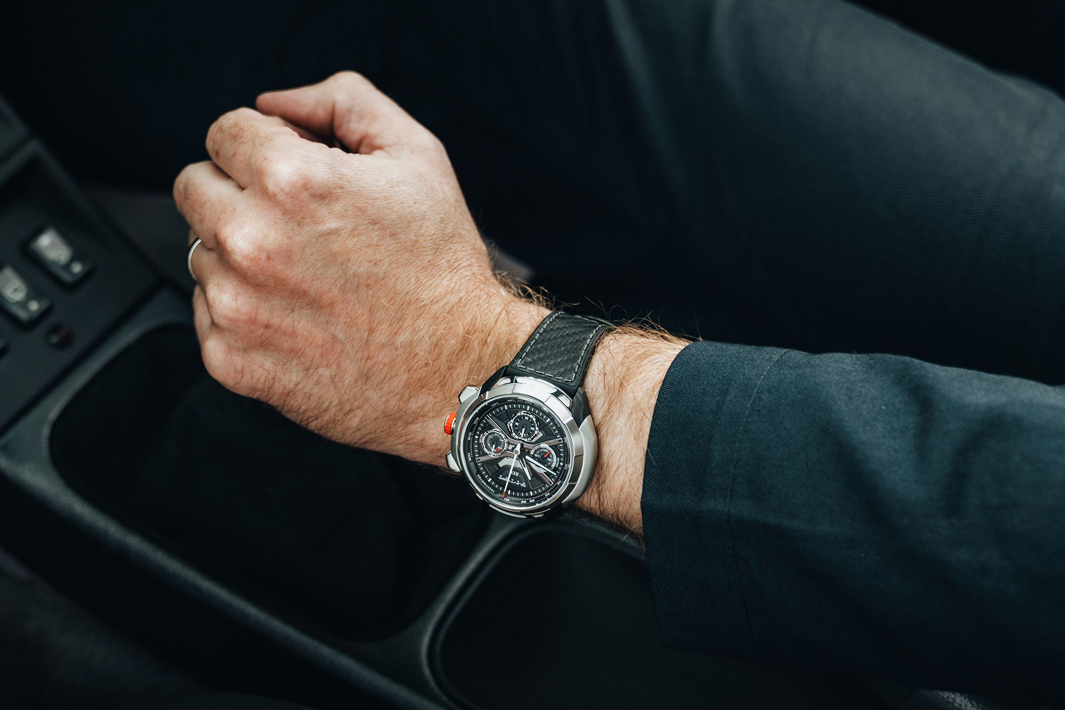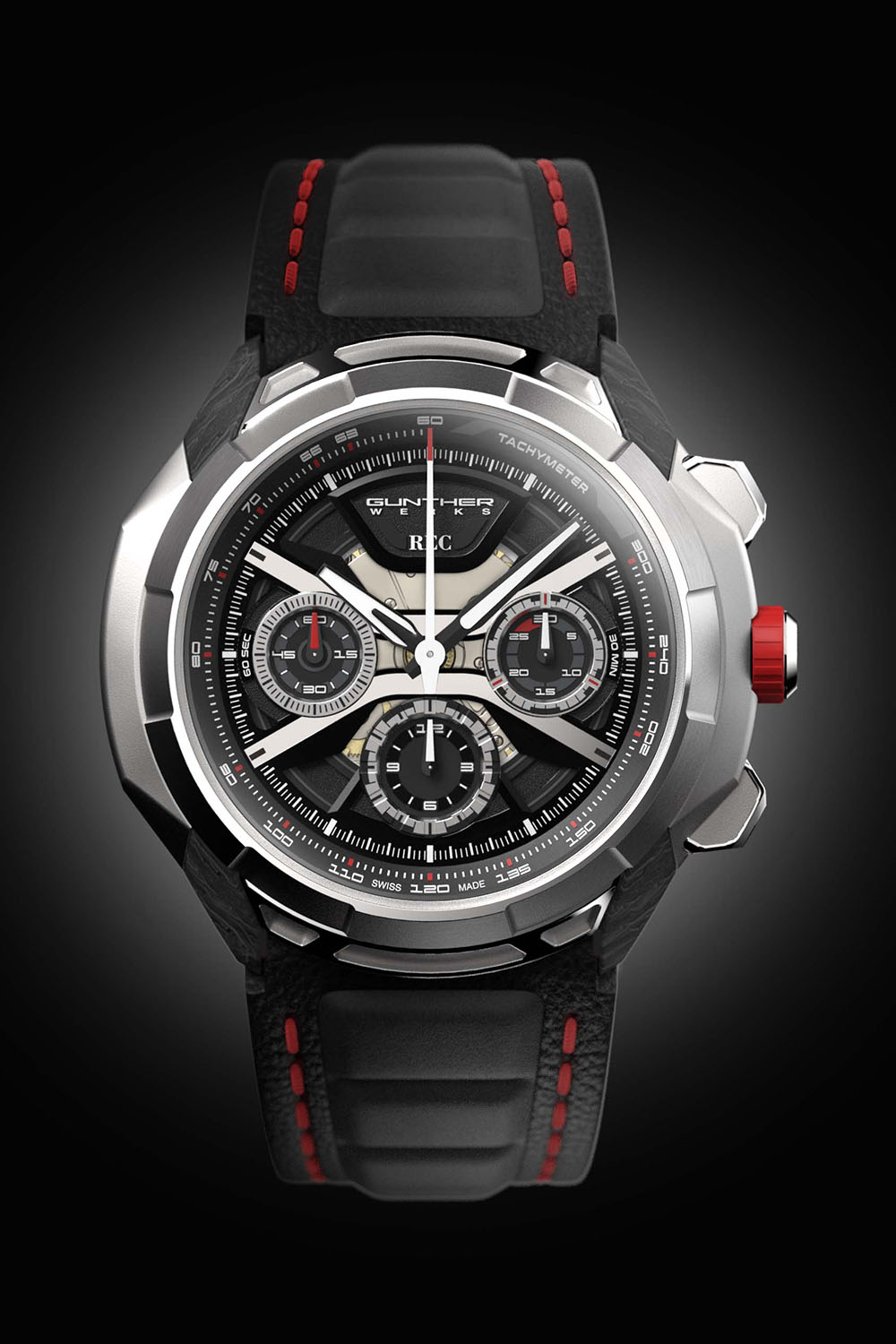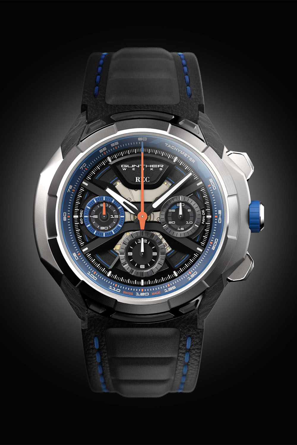 More importantly, Gunther Werks provided REC Watches with carbon fibre from the “Carbon Exoskeleton” and the “Chelsea Grey” build process. REC then granulated and reforged this material with new carbon fibre to create the visible middle section of the 901 GW case, marking a departure from the brand’s more usual way of working, in which the recycled parts are incorporated in the dial. In line with the two cars that inspired the design, there are multiple coloured accents on the dial, strap and crown.