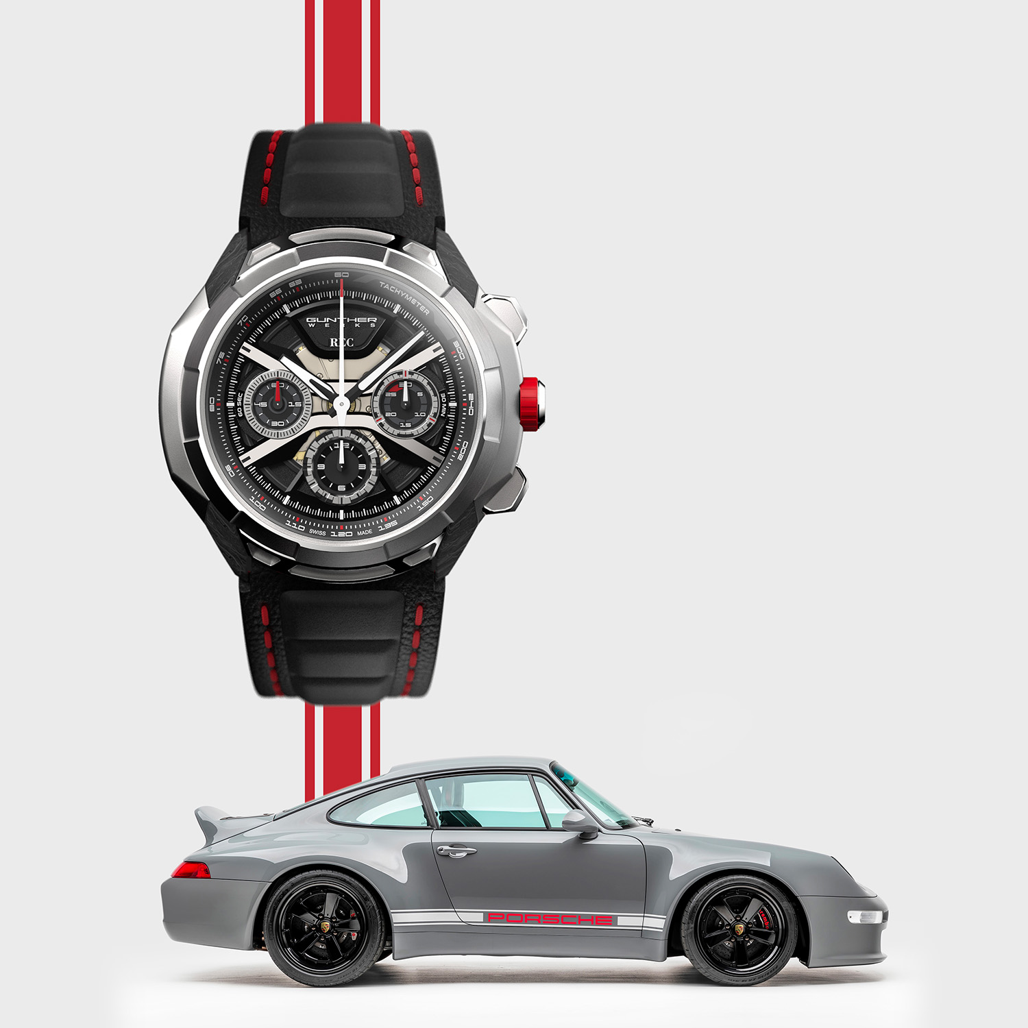 For these new REC Watches 901 GW Exoskeleton & Chelsea watches, the brand has teamed up with Gunther Werks, a California-based company that puts a modern twist on the last air-cooled Porsche 911, the 993. Alongside modifications of the style and technical elements, the main task of Gunther Werks is to strip each vehicle back to its frame before dressing it in its own carbon fibre bodywork. And for these new watches, Gunther Werks provided REC Watches with carbon fibre from the “Carbon Exoskeleton” and the “Chelsea Grey” build process.