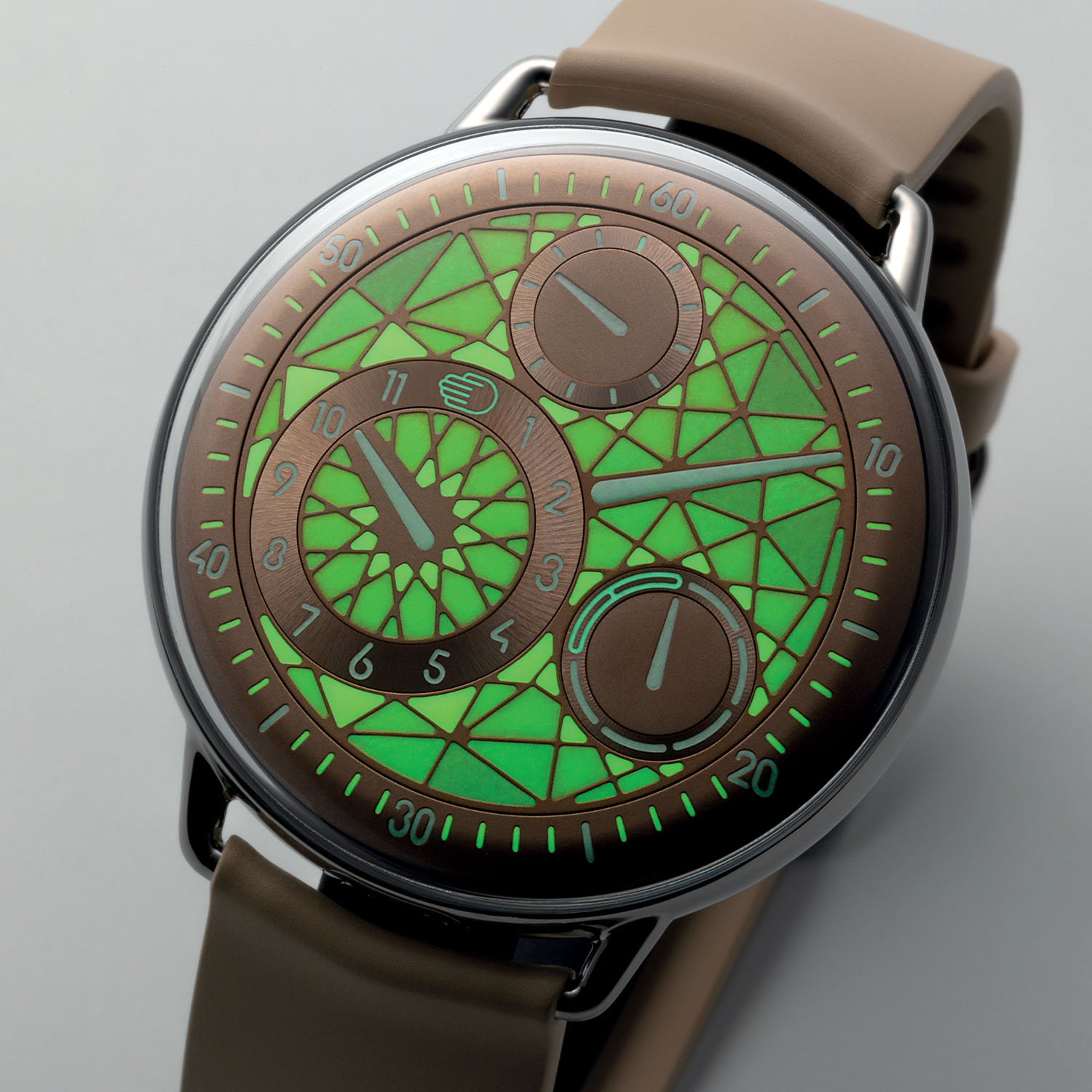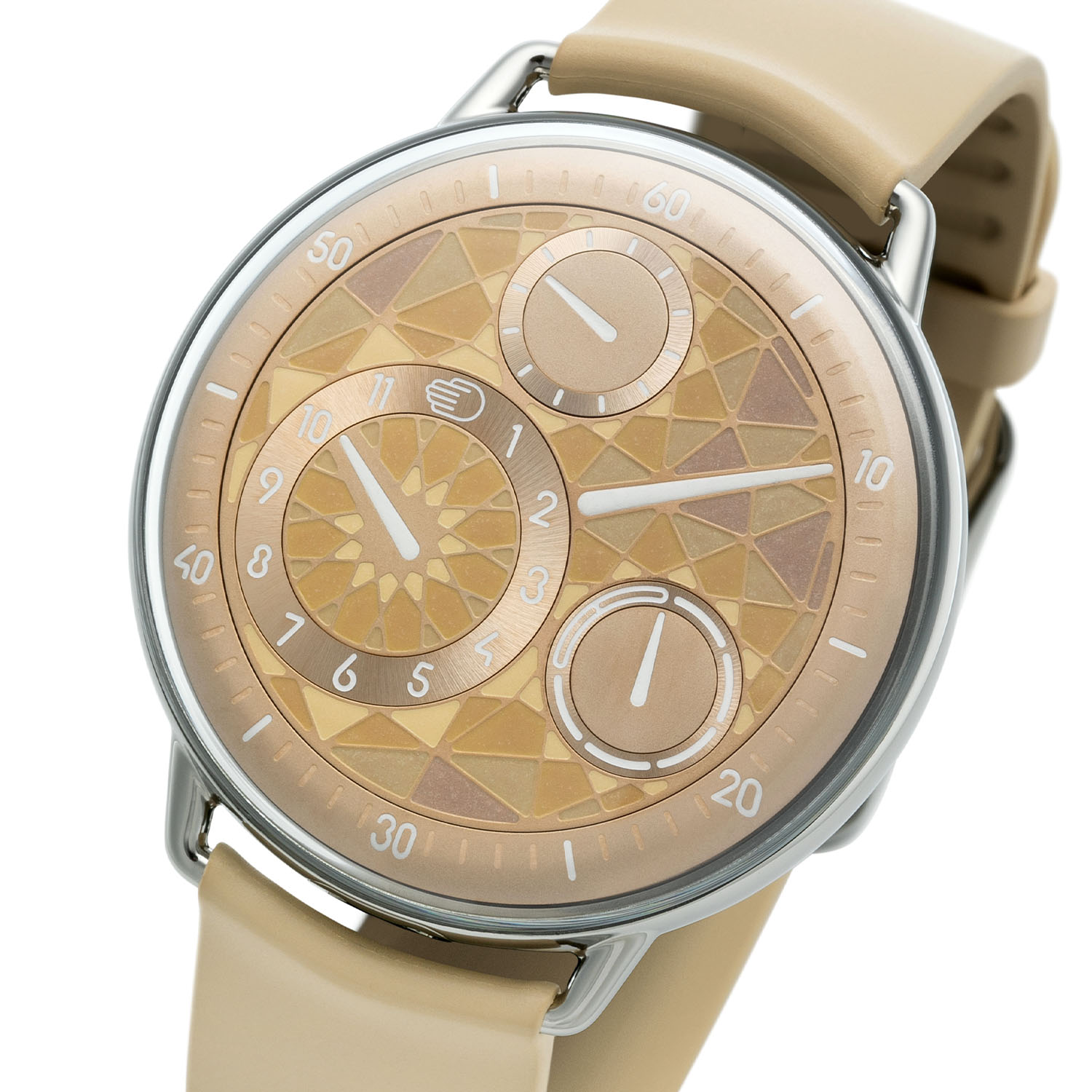 The convex German silver dial, filled with cloisonné and Super-LumiNova and coated in rose gold, presents a familiar yet unique desert-coloured image inspired by Arab Geometric Art. The cloisonné design comes alive in the dark with a gentle green glow. The sub-dials and main disc are in constant motion, powered by Ressence’s patented Ressence Orbital Convex System, driven by a customised 2892 base calibre’s minute axle. Sand-coloured circles surround three eccentric bi-axial satellites for the hours, seconds, and days of the week in the central part of the dial. Minutes on the periphery are engraved into a matching sand-coloured track, and all indices and hands are filled with Super-LumiNova. With a 36-hour power reserve, the Ressence Type 1 DX3 is only splash-resistant.