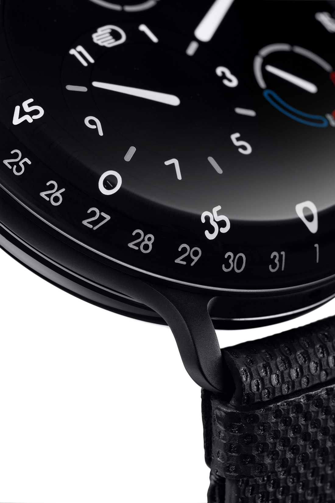 The black dial is distortion-free and the white/light grey elements appear to be within the glass, thanks to the oil-filled design. The display is complex yet simple to understand with a regulator-type experience. The longest hand points to minutes, while the hours are within the large sub-dial at left. Days of the week are within a smaller sub-dial at 12 o’clock with green for the weekend. There’s an oil temperature gauge at 4 o’clock with blue and red (cold/hot) indicators. The outermost curvature has a rotating (pointer) date with a static marker at 6 o’clock. An internal Bellows System for pressure balance compensates for oil temperature fluctuations to maintain accuracy.