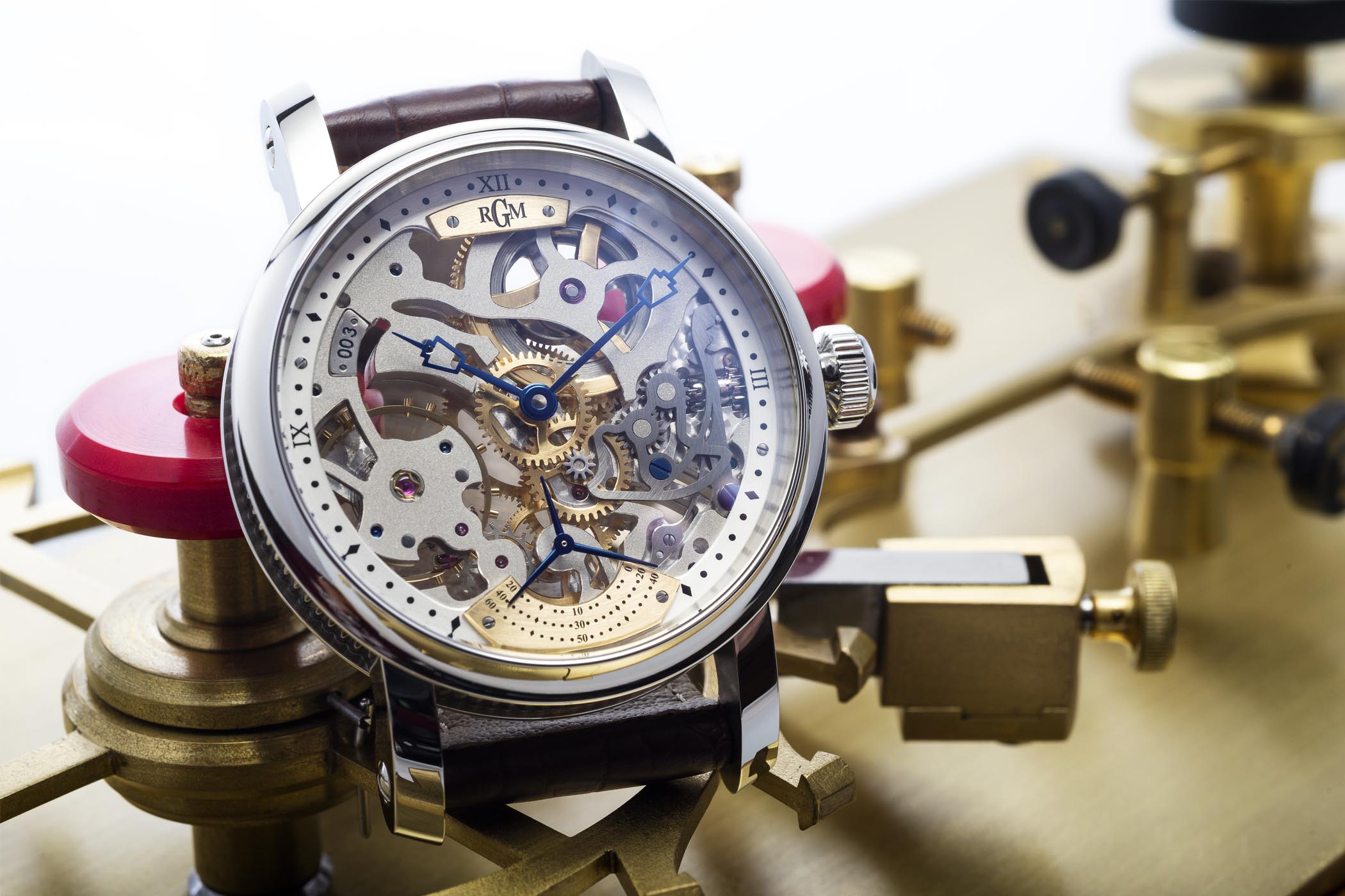 The blued steel hour and minute hands have RGM’s classic keystone aesthetic, seen on many of its calibre 801 pieces. Hand-finishing of the movement includes a matte grain finish with polished bevels (anglage) on the bridges and main plate, perlage and an engraved balance bridge with swan neck regulator. There’s also a unique seven-tooth winding click. An outermost minute track has Roman numerals at 12, 3 and 9 o’clock, and a small plaque at 10 o’clock displays the edition number. At 12 o’clock there’s a gold plaque with RGM engraved.