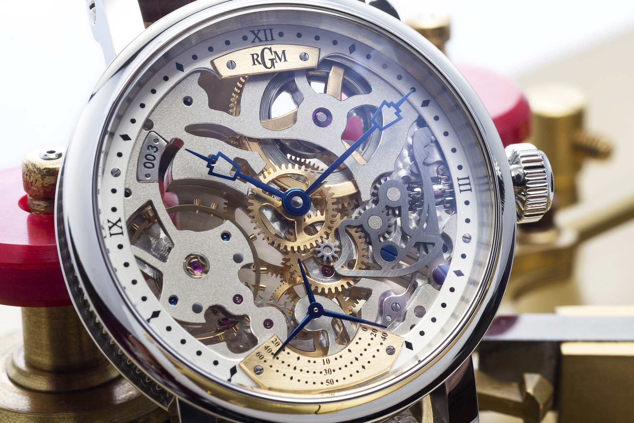 The blued steel hour and minute hands have RGM’s classic keystone aesthetic, seen on many of its calibre 801 pieces. Hand-finishing of the movement includes a matte grain finish with polished bevels (anglage) on the bridges and main plate, perlage and an engraved balance bridge with swan neck regulator. There’s also a unique seven-tooth winding click. An outermost minute track has Roman numerals at 12, 3 and 9 o’clock, and a small plaque at 10 o’clock displays the edition number. At 12 o’clock there’s a gold plaque with RGM engraved.