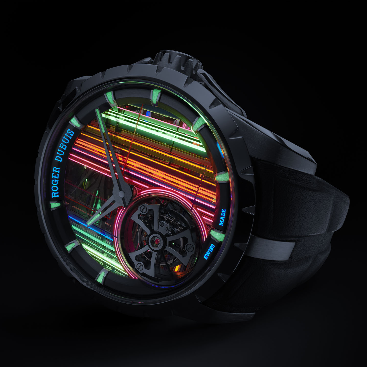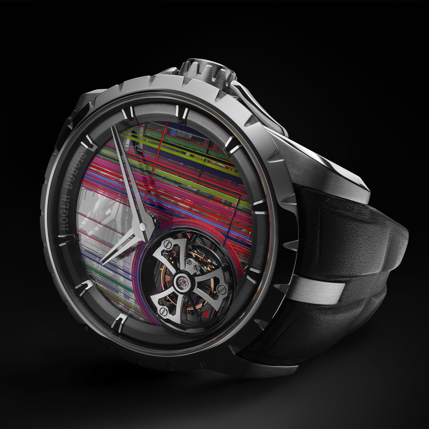 Roger Dubuis created a clever three-layer structure for the Excalibur Liu Wei Monotourbillon to produce an astonishing visual effect. The first layer is a transparent sapphire glass engraved with vertical lines on both sides. The lines are then filled by hand, in an exact process, with every line dried completely; only then the next one could be painted by the craftsperson. The artist redesigned the second layer, the star-shaped bridge of the manually wound RD512 movement, and it was made thinner to accommodate the concept. The third and final layer is a sapphire glass caseback, laser-engraved with horizontal lines and hand-filled with UV paint. The mix of regular paints and UV varieties is said to “create a sophisticated architectural depth under UV light,” with shades of different colours in sync with Liu Wei’s perception of the world’s “vibrancy and energy.”