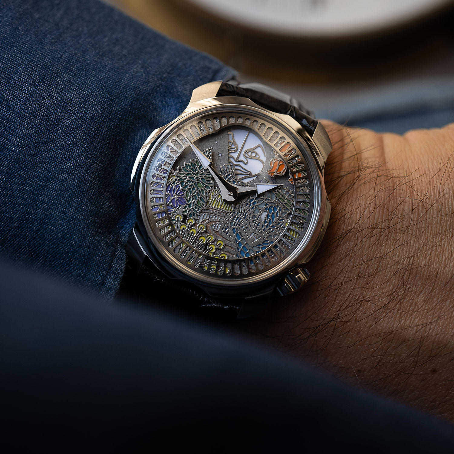 “One fateful night, Na?kki found itself entangled in the silvery bridge cast by the full moon, unable to escape its grasp. As the night wore on, its skin began to desiccate, and its eyes grew dim. With the dawning of the sun’s first rays, the bridge dissolved, and Na?kki let out a soundless cry as it sank into the abyssal depths of the bog. Since that moment, Na?kki has vanished from those waters. Some believe it met its demise, while others conjecture that it gathers newfound strength in the unfathomable darkness,” is the story that the dial of this new watch tells.