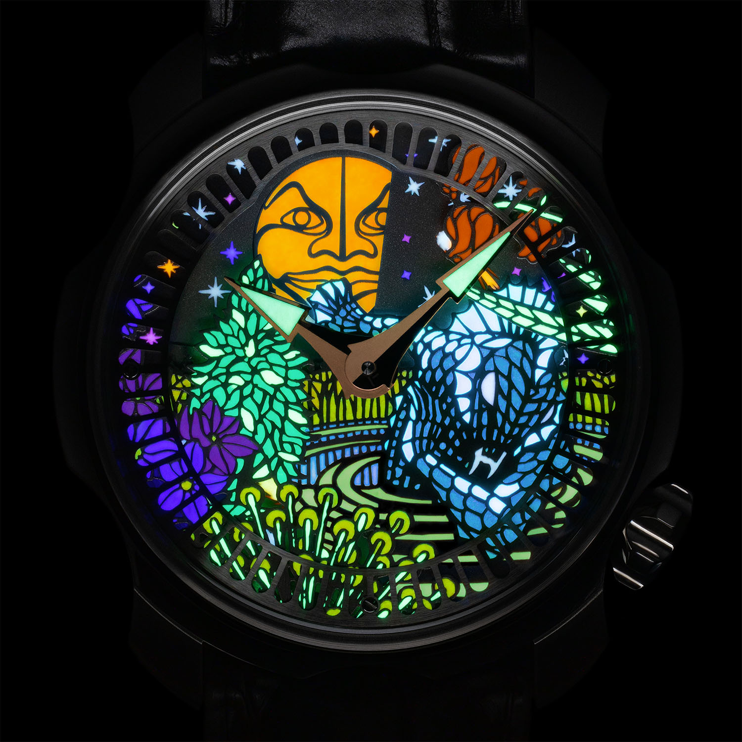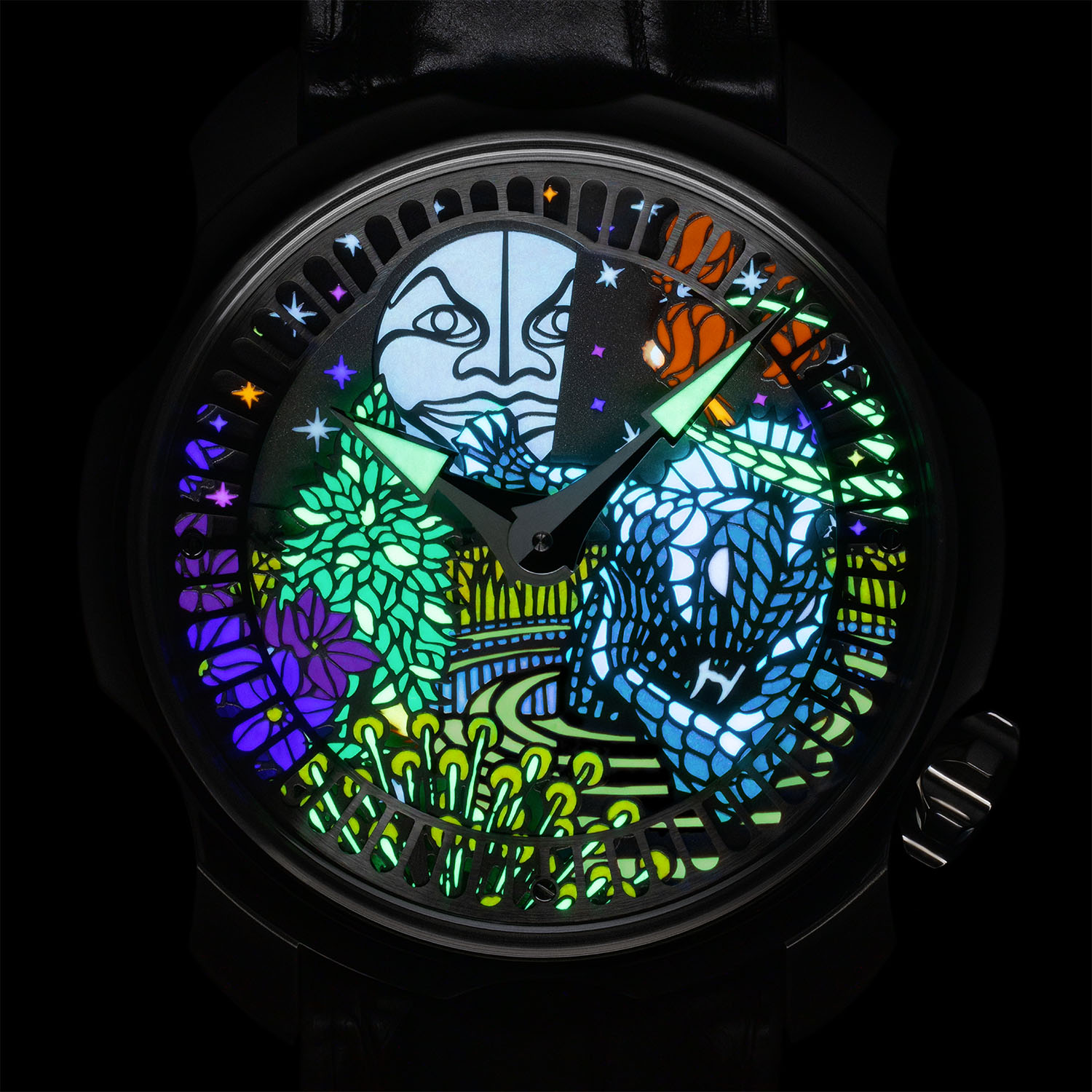 Housed in a classic Sarpaneva case with its scalloped sides and crown at 4 o’clock, this new watch measures 42mm x 11.4mm x 46mm and is made, classically for the brand, in high-grade Outokumpu stainless steel from Finland. Nothing new here… What matters is the dial, a multi-layer succession of fully opened steel plates with no fewer than 650 cutouts. These have two objectives. One, telling the story during the day, in a relatively discreet way, by revealing a nature morte of a swamp, a Moonface and, hardly visible on the right side (it’s a norctunal creature after all), Näkki. The lower plate has been hand-painted with about 15 different colours, revealed by the dial’s cutouts… And they’ve been painted using Super-LumiNova.
