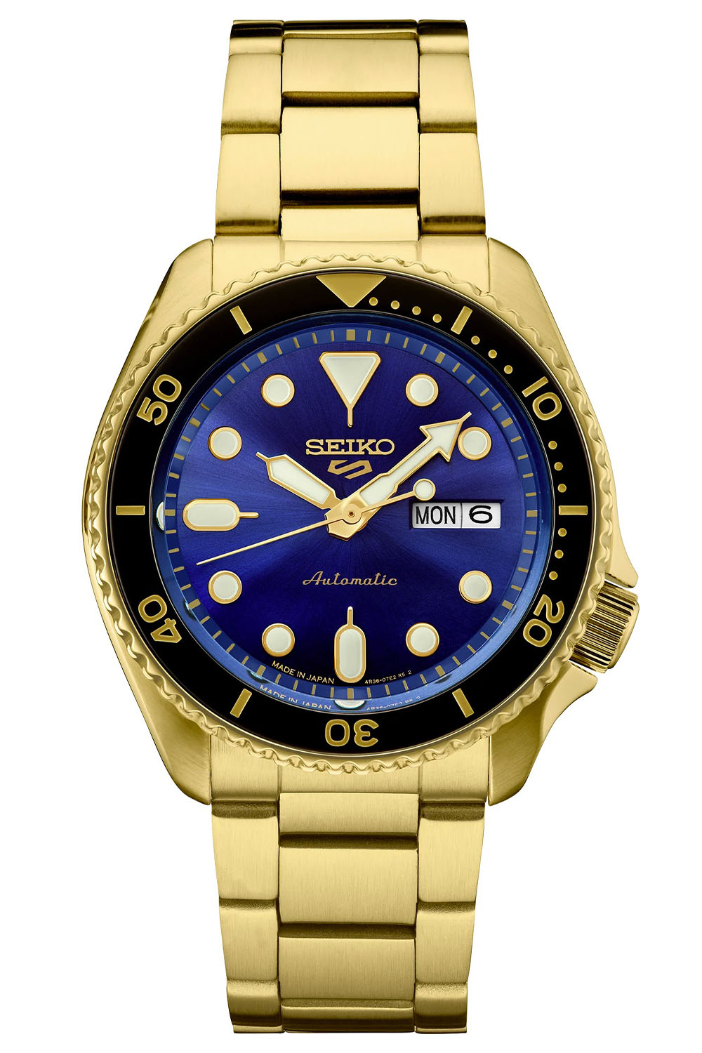 The recipe is simple. Take the best-selling model in the Seiko 5 Sports collection and give it a luxurious touch, by adding a layer of gold colour to the cases and bracelets. The look of gold, without the cost of gold. Some purists will probably say that this is cheating, but not everybody can afford a solid gold watch. There’s nothing wrong with a bit of bling from time to time, right? Specifically when it’s done by flexing a robust watch with true pedigree and undeniable watchmaking credentials.