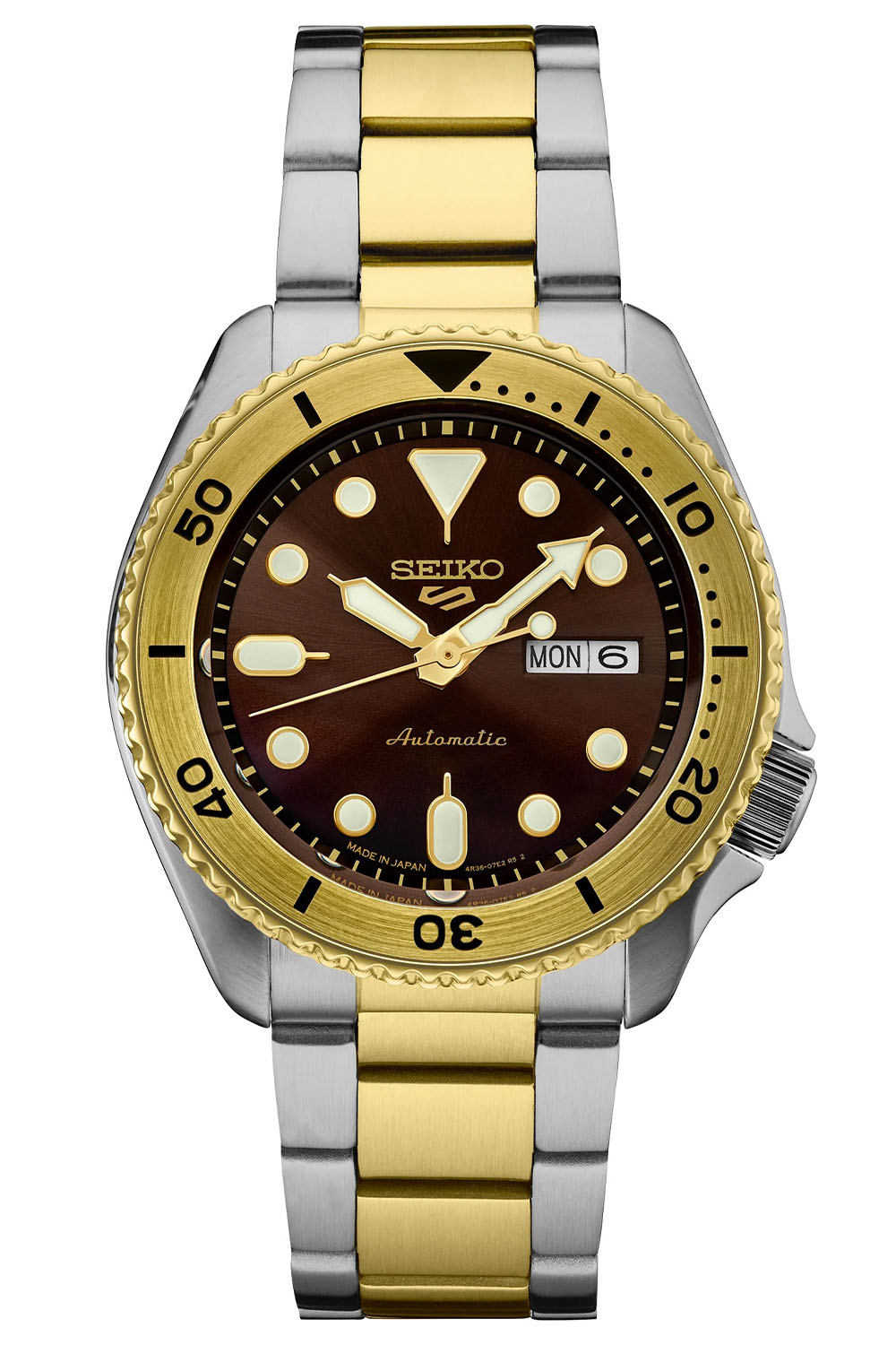 The two other models in this US-exclusive collection are so-called two-tone or bicolour watches, mixing steel with gold-coloured elements (bezel and mid-links). The SRPK22 mixes this bico effect with a black bezel and a charcoal-toned brushed dial. The SRPK24 adds a warmer effect with a gold-coloured and brushed bezel insert, while the dial is brushed and brown. Both have golden accents on the markers and hands.