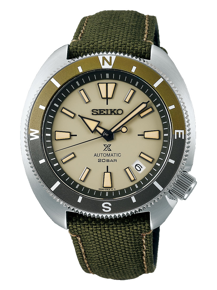 - SRPG13K1 – steel case, beige dial, beige/green bezel, green textile strap