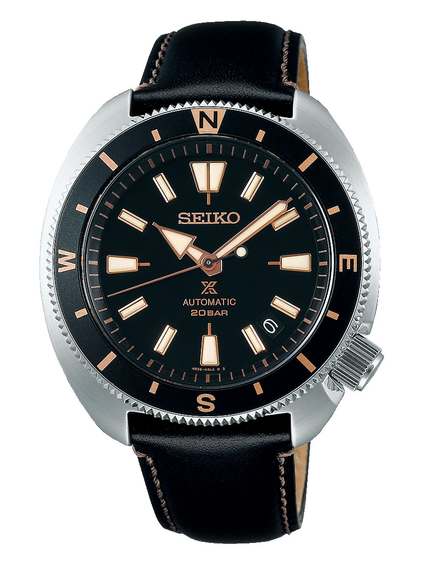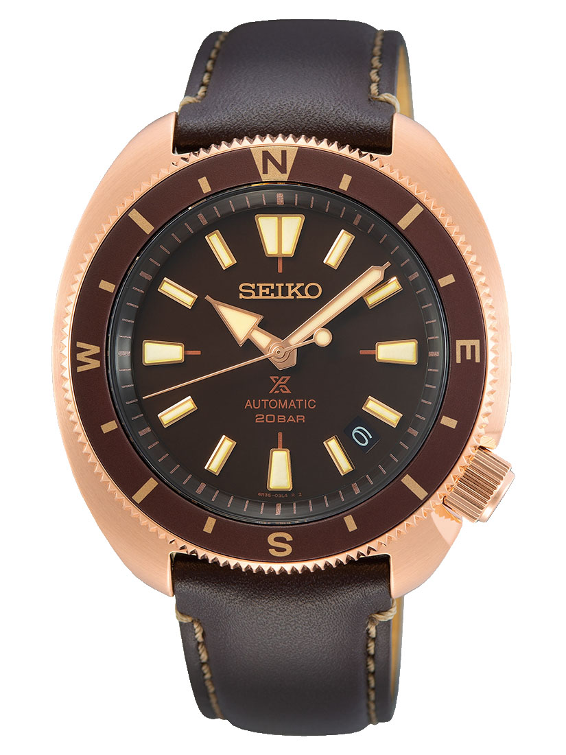 - SRPG18K1 – gold-coloured steel case, brown dial, brown bezel, brown leather strap