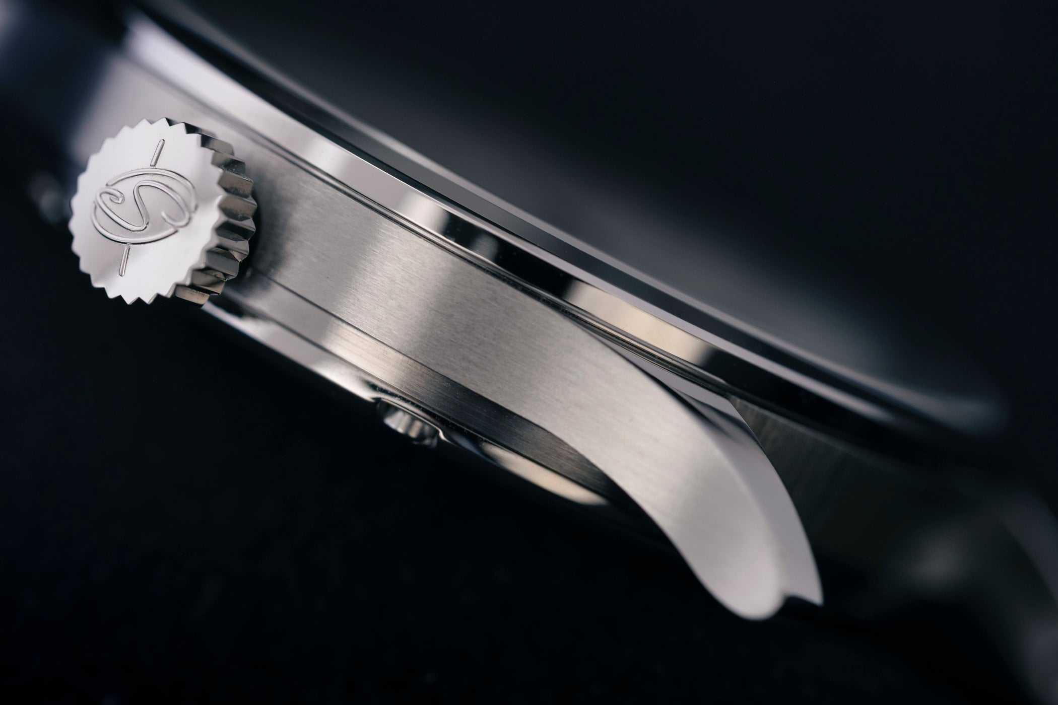 The design dial is typical of a dress watch from the 1930s through 1950s, and it’s exactly what Sergino and Robert were aiming for. The base dial comes in four colourways: Silver, Champagne, Blue and Red, all with a vertically brushed finish. The stand-out features are the fine machine-engraved Breguet-style numerals and dotted minute/hour track on the outer edge of the dial. These engravings are given a black electroplated finish to add contrast and depth, and time is indicated with thermally blued spade hands. The ‘Signature’ script in the lower half is also machine-engraved, but electroplated in a gunmetal tone. The finishing touch to this otherwise restrained yet balanced dial is the black printed name of the brand and its origins up top.