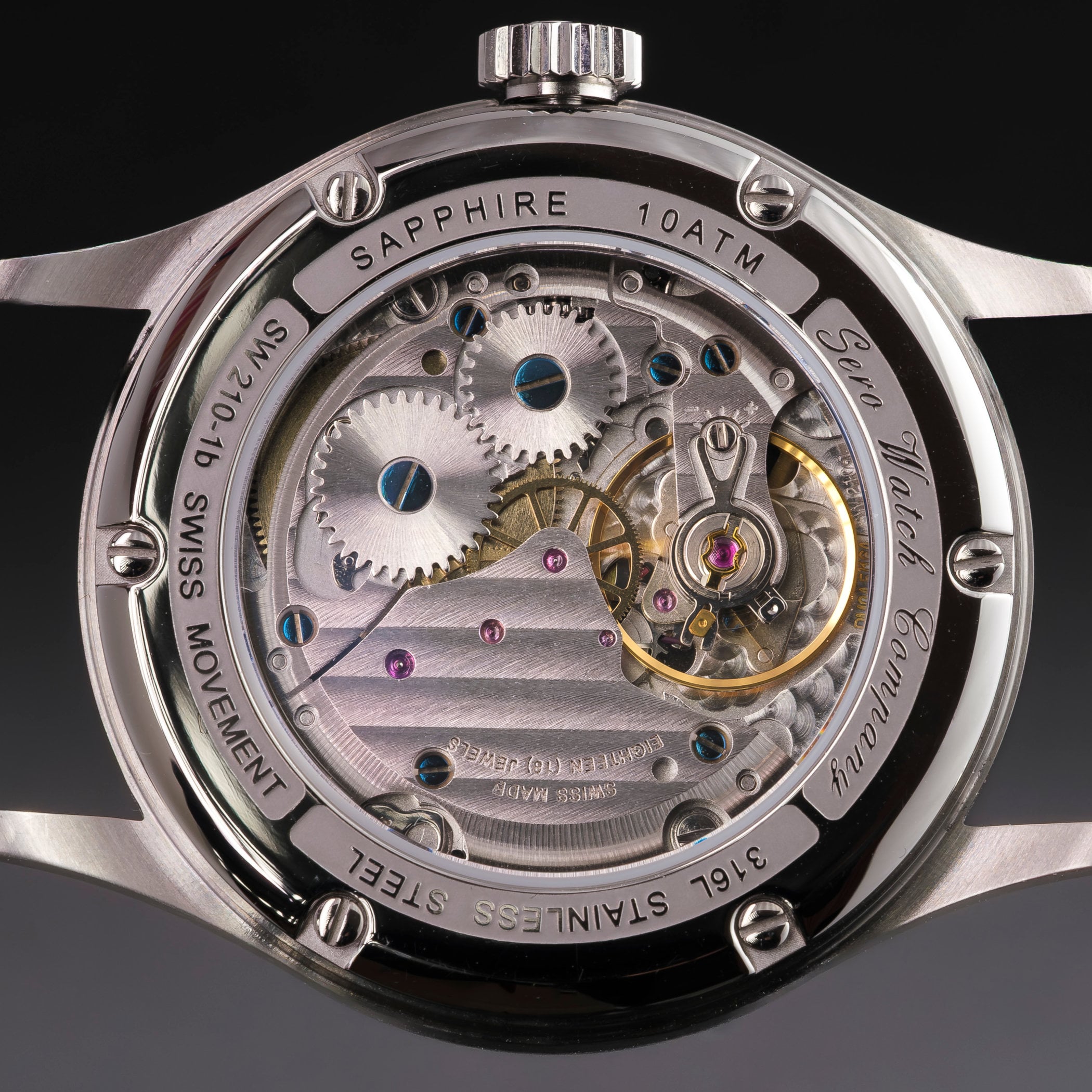 Despite its very vintage appeal, the Sero Signature relies on modern Swiss mechanics, in the form of the Sellita SW-210-1B. This manually wound, and rather slim calibre is based on the architecture of the Peseux 7001. With a size of 25.6mm by 3.35mm, it is the prime reason for the Signature’s pleasant dimensions. Running at a rate of 21,600vph, it holds up to 45 hours of power reserve. The Elaboré-grade movement can be seen through the caseback, with Geneva stripes, blued screws and snailed wheels. It’s nothing spectacular, but overall very nicely done and, rather importantly, reliable and easily serviced if needed!