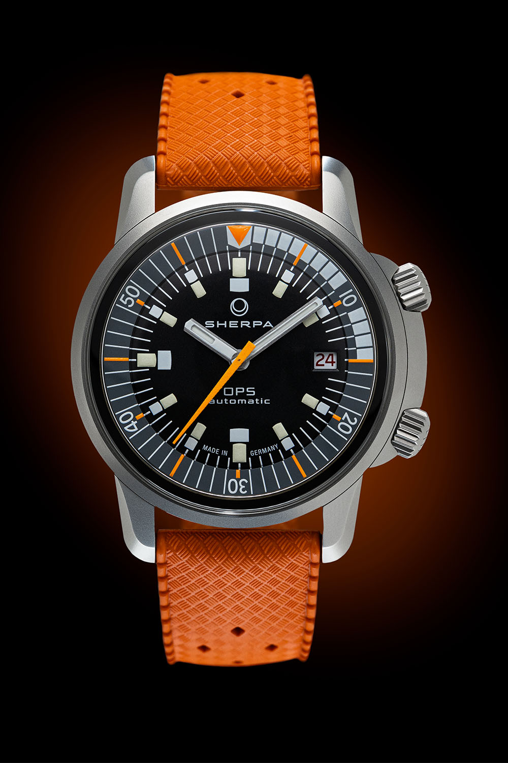 The dials are domed and printed partially with a custom “Sherpa Orange” Super-LumiNova. The seconds hand, too.