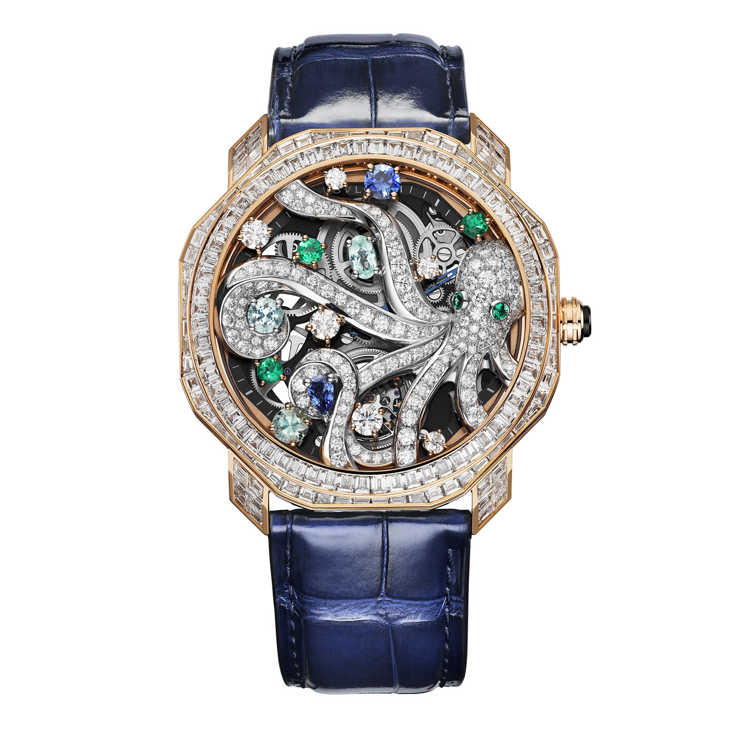 One look at this watch with its diamond-set octopus guarding the movement, and you’ll be humming “Octopus’s Garden” by the Beatles. Crafted in white gold, the octopus and his tentacles concealing the movement are brought to life with a dynamic setting of diamonds, sapphires, emeralds and neon-blue Paraiba tourmalines. However, raising the hinged secret cover containing the octopus reveals a second octagonal bezel set with brilliant-cut diamonds framing the modern, ultra-thin BVL 268 SK calibre with flying tourbillon. Beating at 21,600vph, the 1.95mm thick calibre delivers a power reserve of 52 hours.
