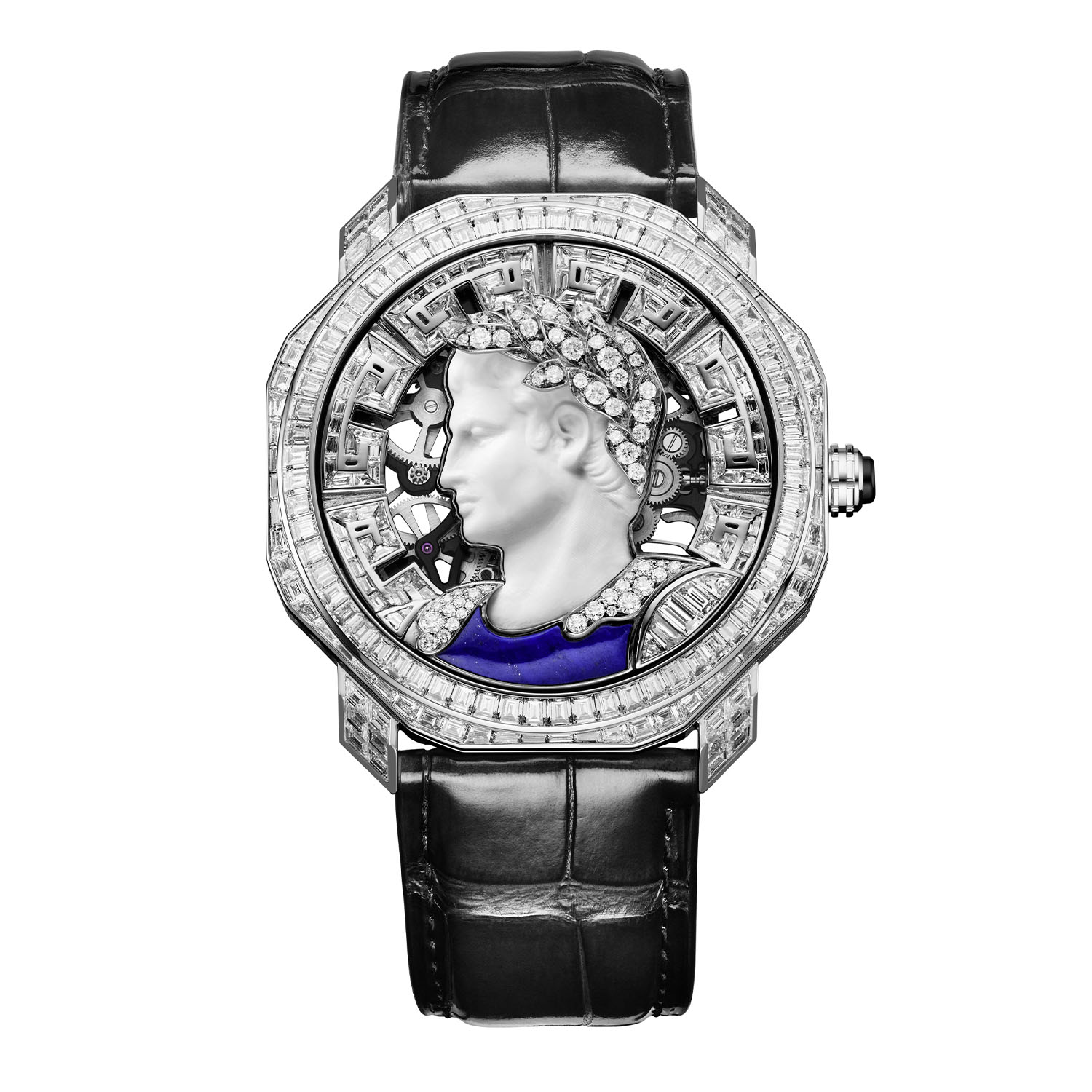 Summoning the imperial grandeur of Ancient Rome, the second secret watch hides its mechanism with a cameo of Augustus Caesar, the first emperor of Rome. Dating back to the 5th century BC in Greece, cameo art became popular in Rome under Augustus. To recreate the traditional technique of cameo carving, Bulgari collaborated with skilled cameo artisans in Torre del Greco (just outside Naples). Depicted in profile, the cameo portrait of the Emperor is beautifully executed, and his head is embellished with a diamond laurel wreath, while his toga is made of lapis lazuli and his protective armour of diamonds. The cameo is, in turn, framed by a diamond-set meander, a decorative geometric Greek motif used extensively in Roman art.