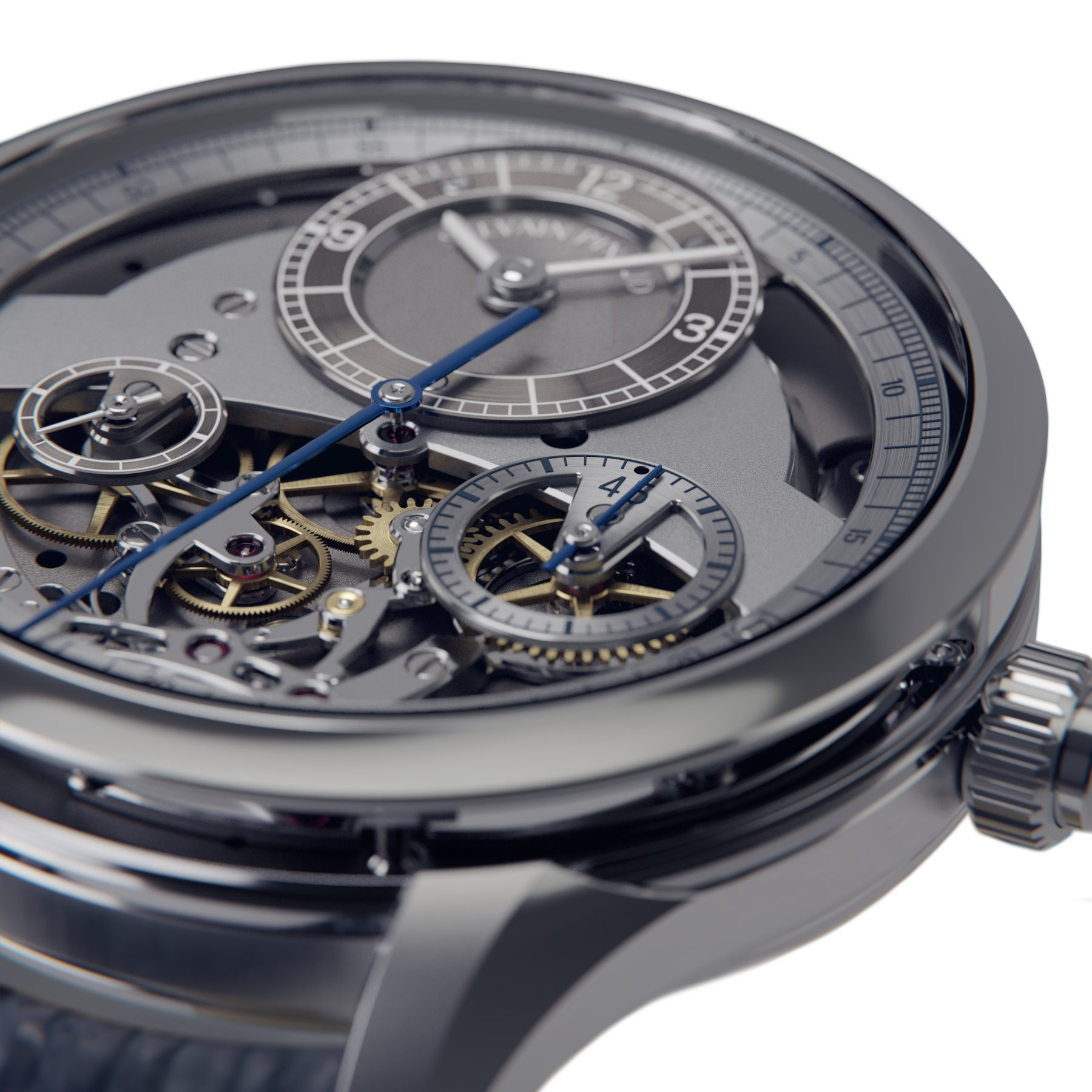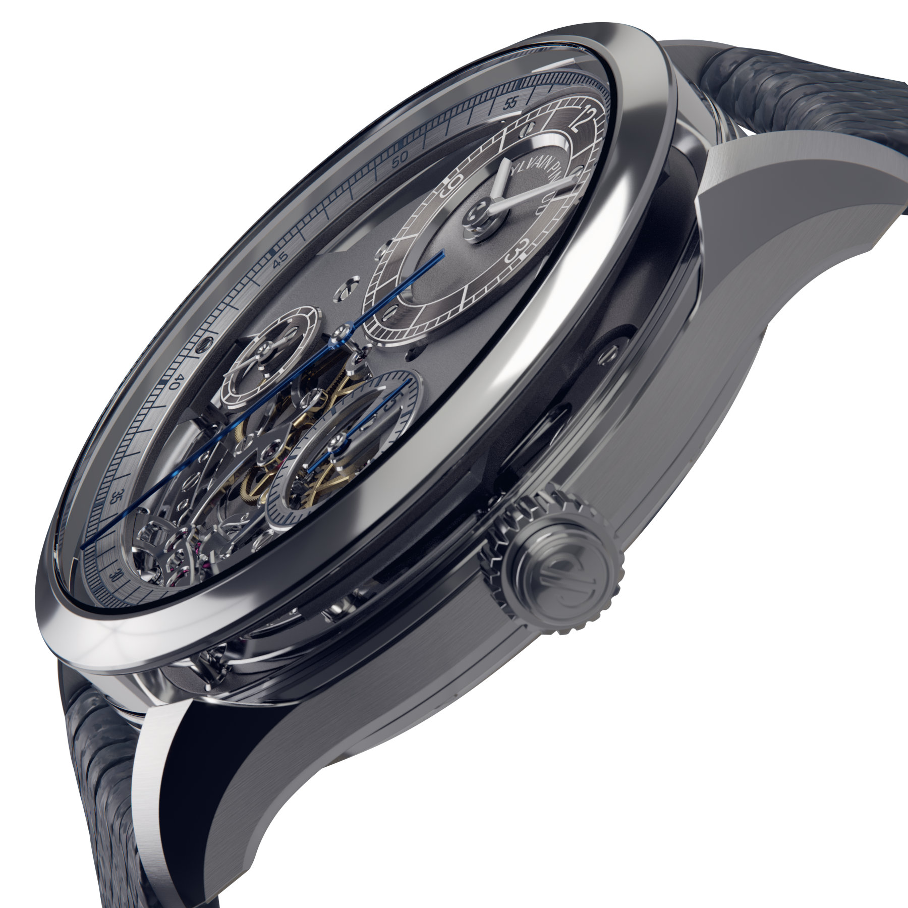 Bringing together the best in independent watchmaking, the dial for the hours and minutes is made by Comblemine, the dial manufacturing company of Kari Voutilainen. This is positioned on top of a broad bridge-like component and pushed into the upper half of the case. The dial has a recessed frosted centre section, with a circular brushed sector-like track on the outer edge separated by a bevelled edge. Time is indicated with polished stainless steel hands, and blued steel hands for the chronograph indications. The central chronograph seconds hand runs along a circular brushed track on the outer periphery, with a seconds scale in blue. Everything blends together beautifully, and even from these renders you already get a real sense of the depth of the entire construction.