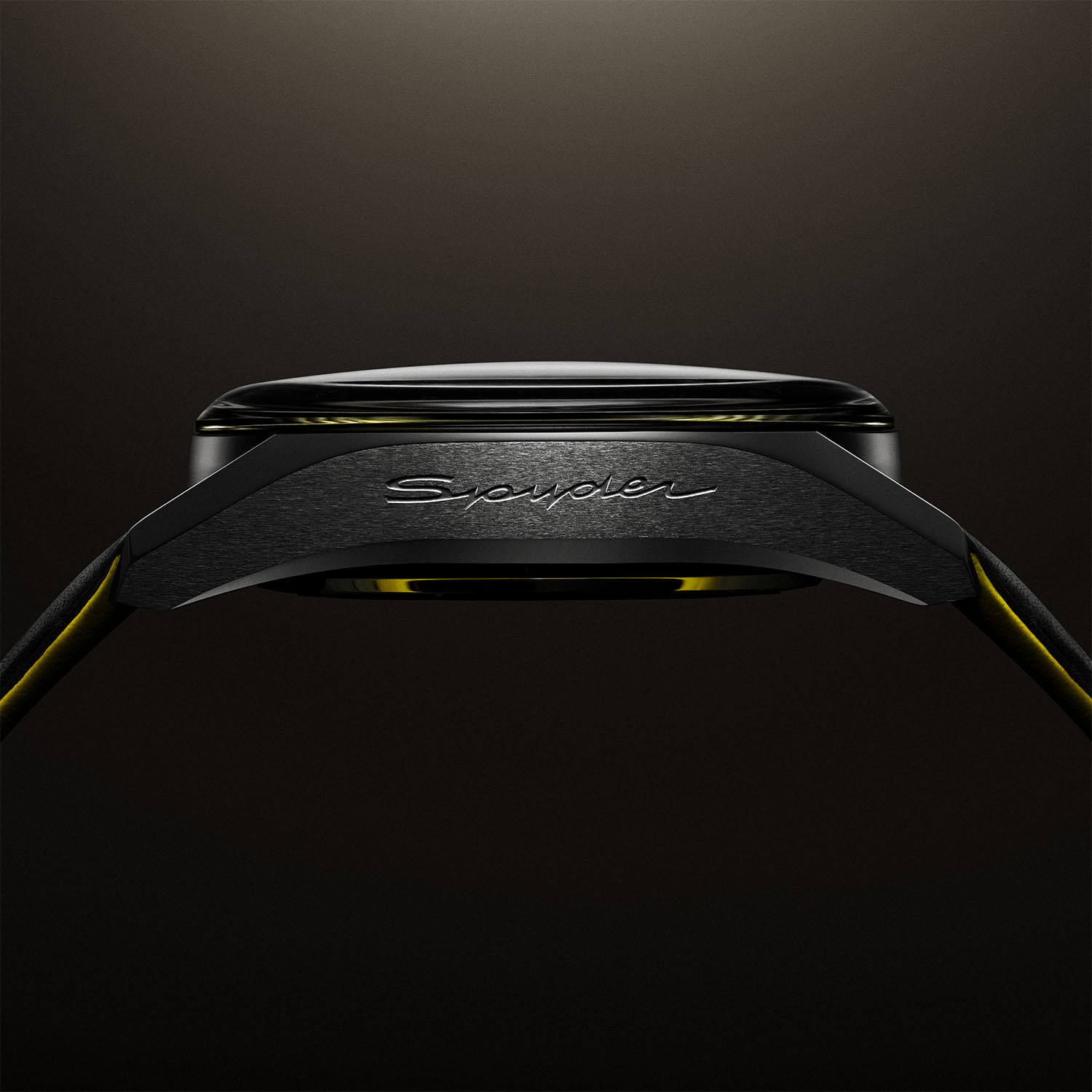 The case remains a 100m water-resistant, stainless steel, bezel-free construction, 42mm x 15.1mm, with the domed sapphire Glassbox crystal and exhibition caseback. It also retains the overall design with the crown at 3 o’clock and classic round chronograph pushers, combining brushed and polished finishes, and features an engraved historical Spyder logo on the side and special limited edition engravings on the screw-down caseback. The revamped, bold dial design truly sets the new reference apart, perfectly capturing the thrill and intensity of the race theme.