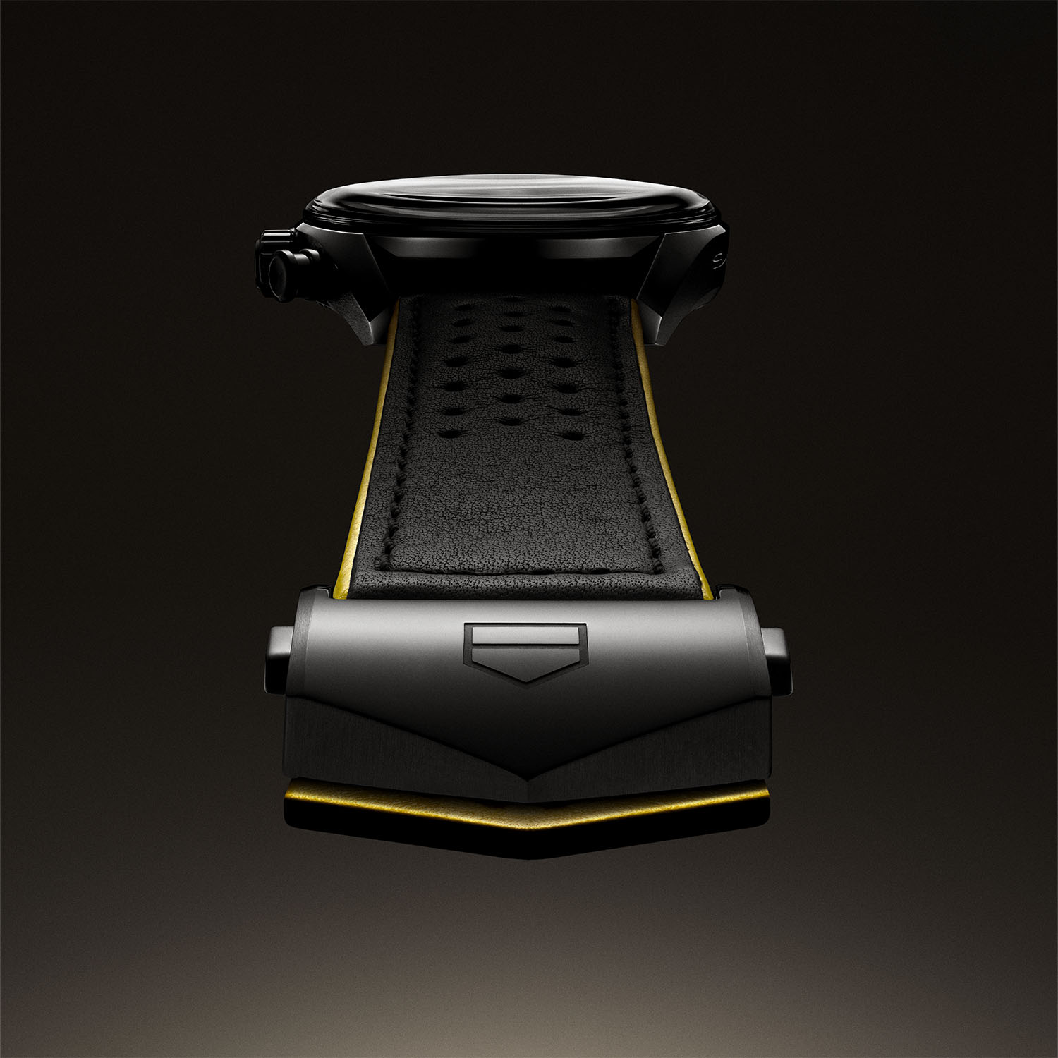 The watch is worn on a black perforated calfskin leather strap featuring yellow lining. A finely brushed and polished steel folding clasp with double safety push-buttons ensures a secure fit on the wrist. This limited edition is restricted to 225 pieces, priced at CHF 35,000 and now available for purchase. For more, please visit tagheuer.com.