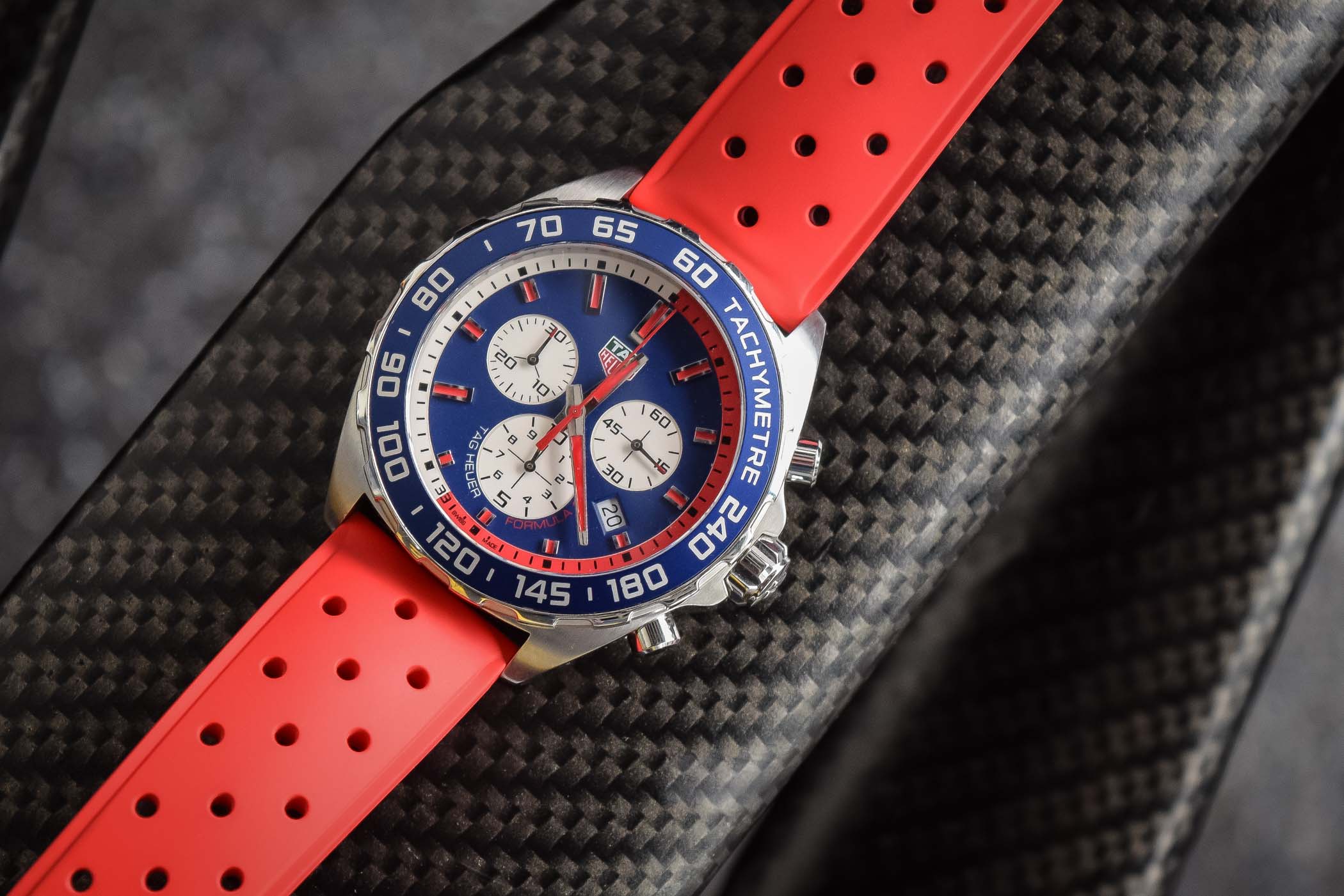 - Strap: perforated red rubber strap with brushed steel pin buckle and Tag Heuer engraving