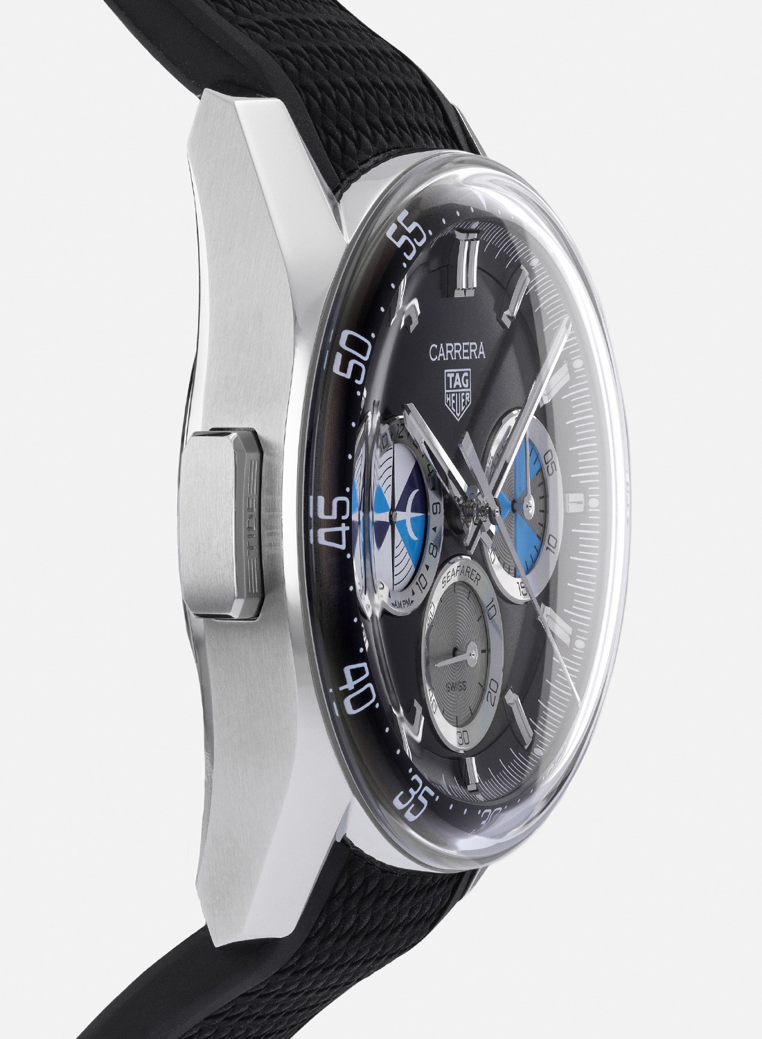 The black opaline dial features a prominent minutes track segmented into 5-minute intervals, with numerals, at the periphery. The second’s track is one step closer to the centre, surrounded by applied, faceted baton-style hour indices for easy time reading, consistent with other TAG Heuer Carrera “Glassbox” models. The recessed subdials with silver rings indicate their functions: the “regatta” counter at 3 o’clock tracks chronograph minutes (up to 30), the subdial at 6 marked “Seafarer” shows the running seconds, and the sub-register at 9, with segments in white and two shades of blue, serves as the tide indicator.