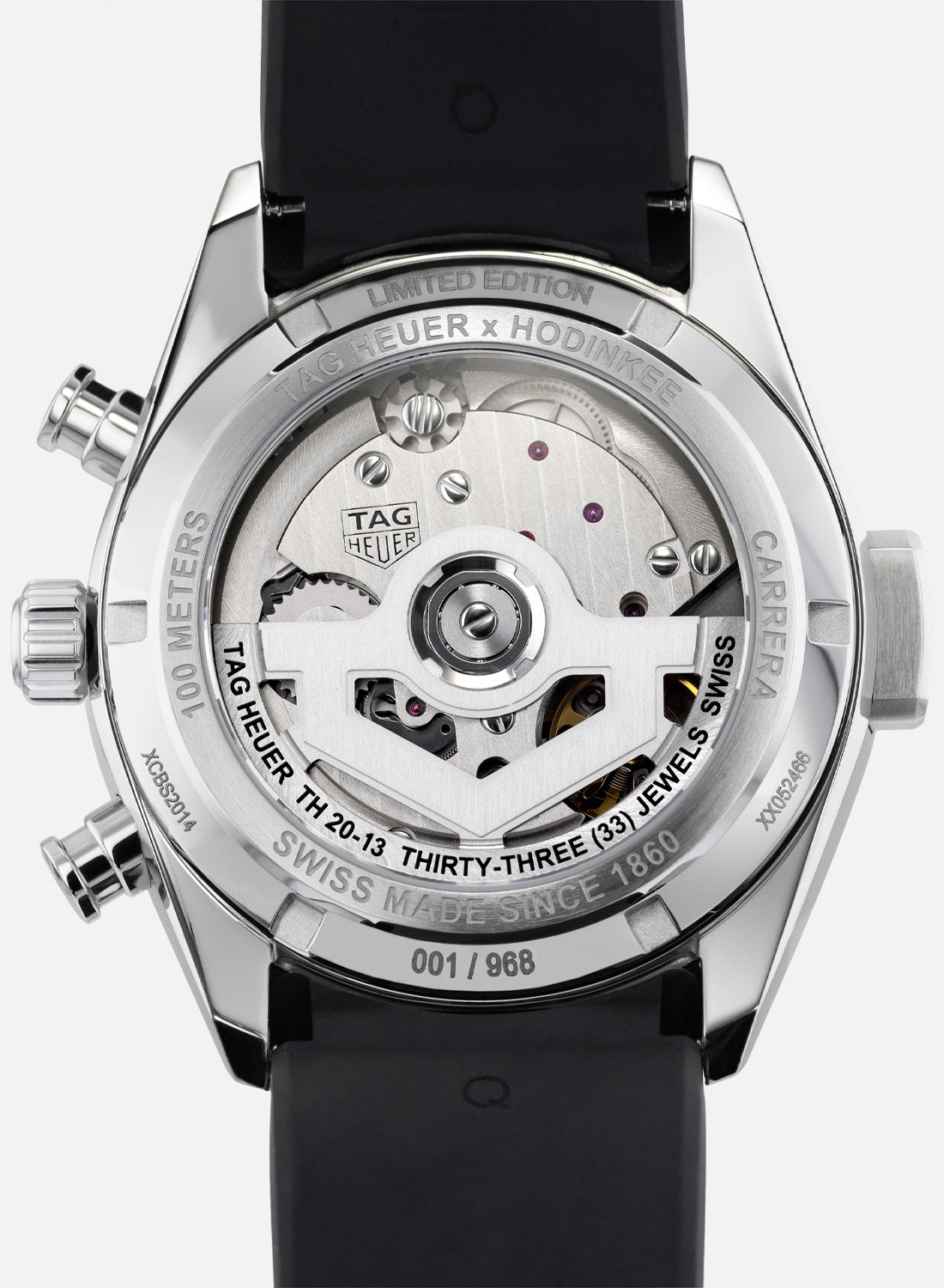 The hands maintain the familiar Carrera shape, and Super-LumiNova is applied to both the hands and dial for legibility in the dark. The TAG Heuer Carrera logo adheres to the brand’s modern design codes, while the date window has been omitted with respect to the original reference.