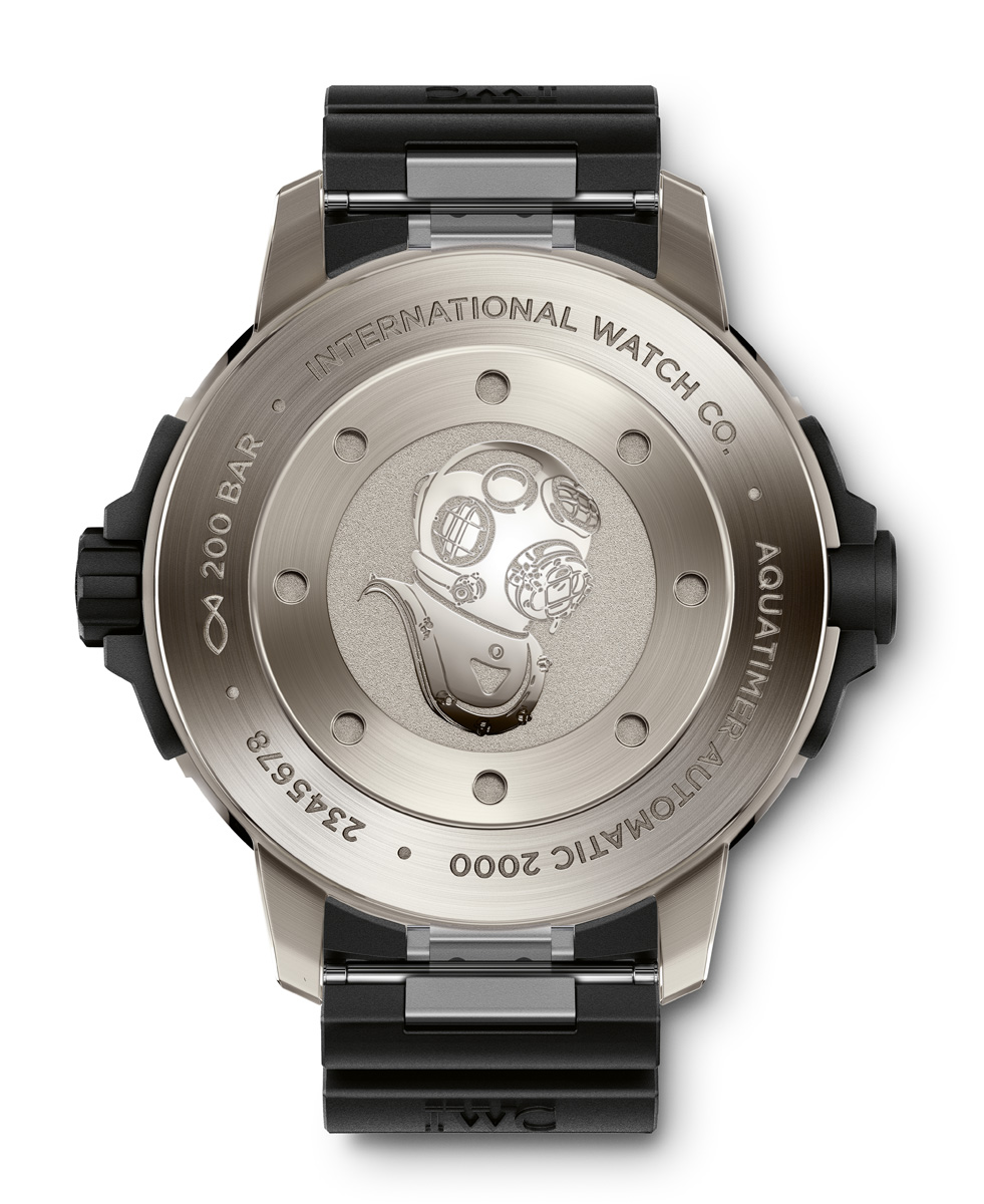From now on, the water resistance of all Aquatimers, will be engraved in the case back and will be noted in bar, instead of in meters or feet. Another novelty is a new, patented bracelet quick-change system. The bracelet is attached to the locking bar from above and engages audibly. To release it, the locking lever is pressed outward with the thumb and the bracelet pushed upward to disengage it. This makes it easy to change from stainless-steel bracelet to rubber strap and vice versa, or to switch to an extra long XXL rubber strap that can be worn over a dry-suit.