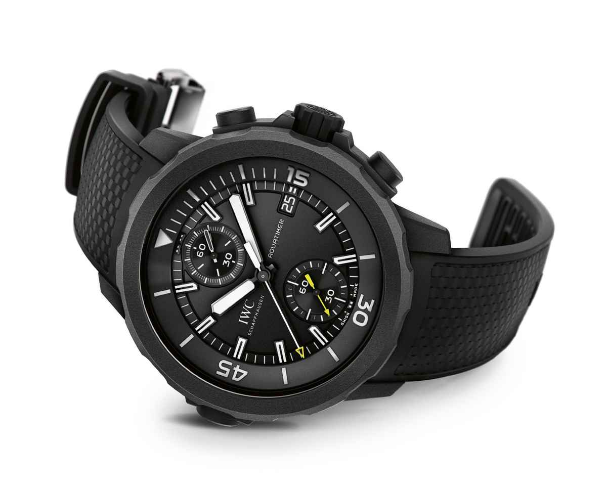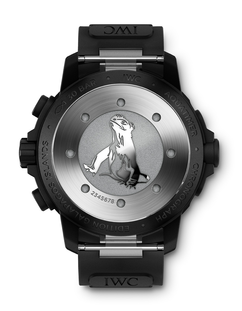 Another piece that we’re allowed to show you, is the Aquatimer Chronograph Edition “50 Years Science for Galapagos” (Ref. IW379504), which is limited to 500 watches. IWC has a close relation with the Charles Darwin Research Station on the Galapagos Islands. The Aquatimer Chronograph Galapagos is water resistant to 300 meters and its case has a black rubber coating. Inside ticks the IWC-manufactured caliber 89365, with a 60-minute counter at the 12 o’clock position, a central chronograph second hand and the running seconds are at the 6 o’clock position.
