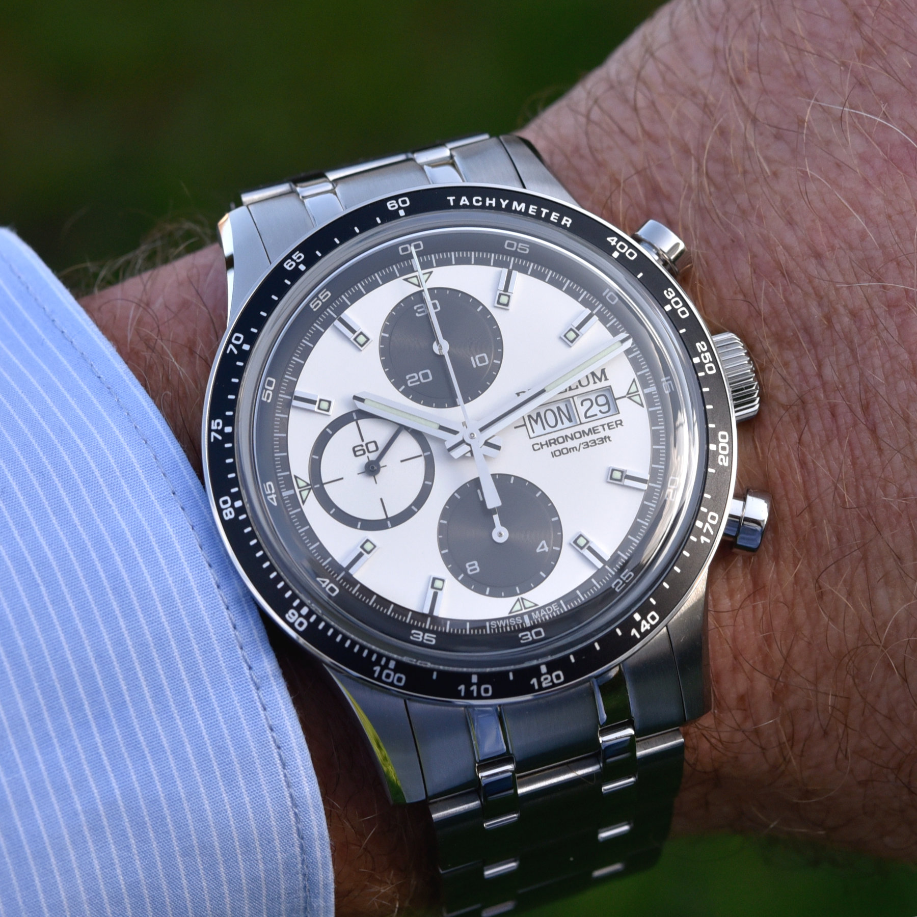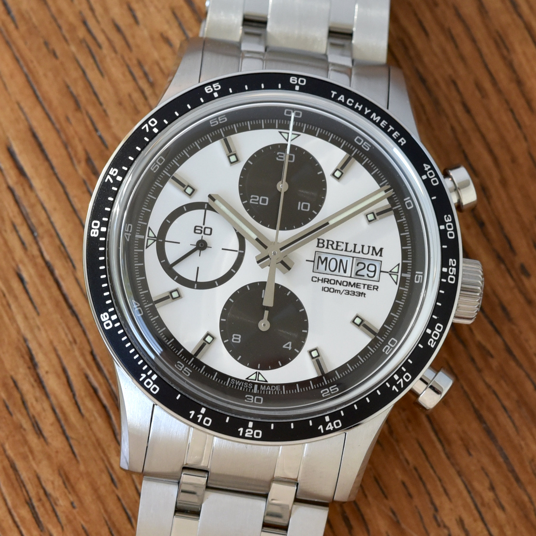 A racy black-and-white panda suit for Brellum’s chronograph with day/date and a chronometer-certified Valjoux movement.