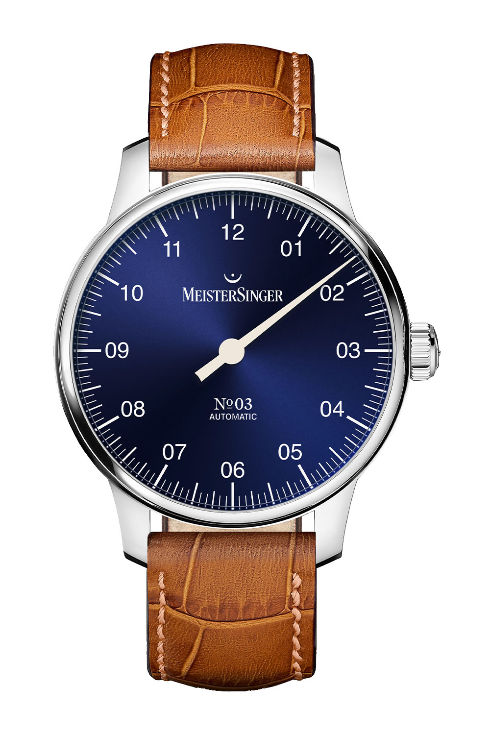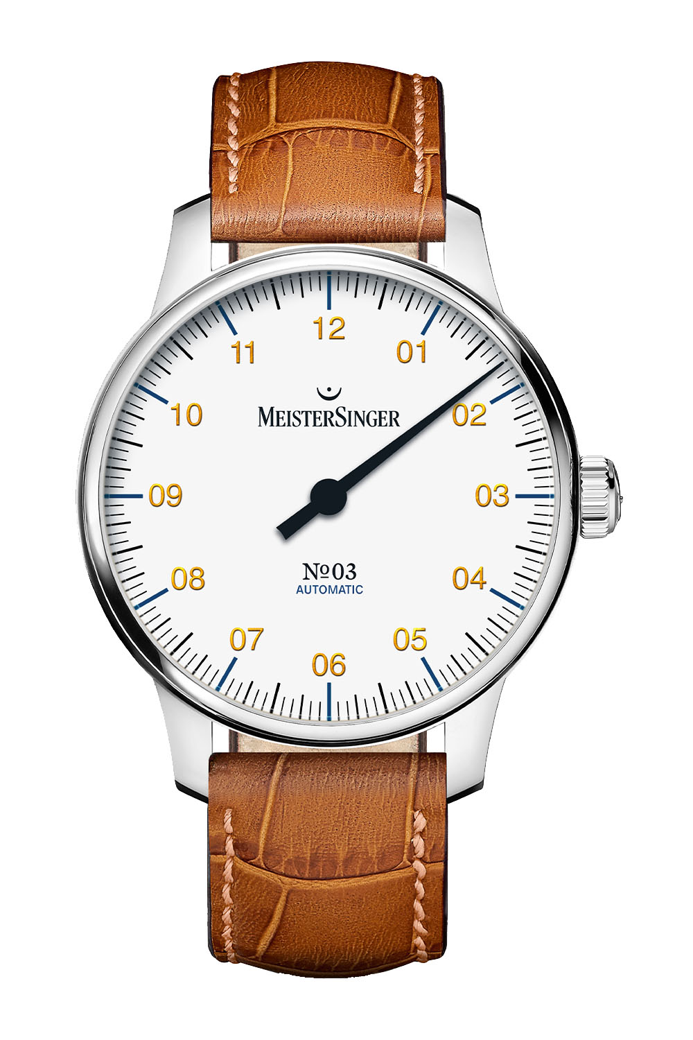 Available in signature MeisterSinger colours, the new No.03 comes with an ivory dial with black numerals, a sunburst blue dial with white numerals and a white dial with golden numerals. While some of the larger 43 and 40mm models have a circular date window, the new 38mm watches only deliver the hours and minutes in signature MeisterSinger style.