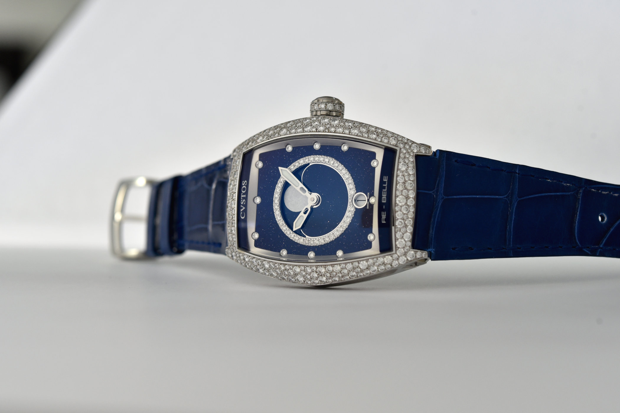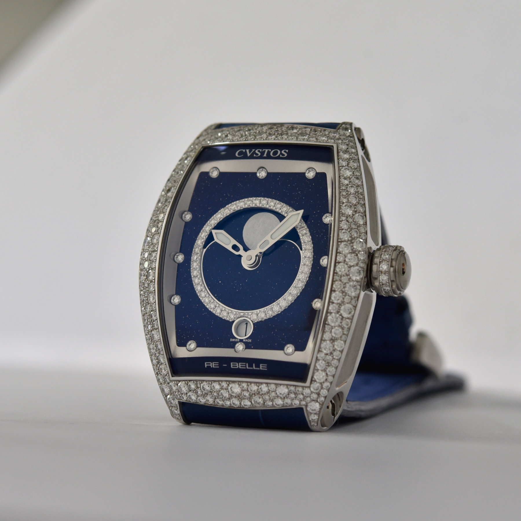 Another relative newcomer on the independent watchmaking block is Cvstos, a niche Geneva-based brand founded in 2005 by Sassoun Sirmakes, son of Vartan Sirmakes of the Franck Muller Watchland Group. With a preference for tonneau-shaped cases across all its collections, it will not come as a surprise that co-founder and chief designer Antonio Terranova worked at Richard Mille long before his adventure at Cvstos. Like many watch brands, the core collections are based around land/Chronograph, sea/Sealiner and air/Jetliner, and a new Metropolitan luxury sports watch collection was launched earlier this year. Among the more extensive and diverse portfolio of watches is a smaller line-up known as Re-Belle, released in 2021. Still offering a robust 100m water-resistant case, the limited-edition models come with moon phase functions, mother-of-pearl or aventurine dials and a wide sway of gem-setting choices.