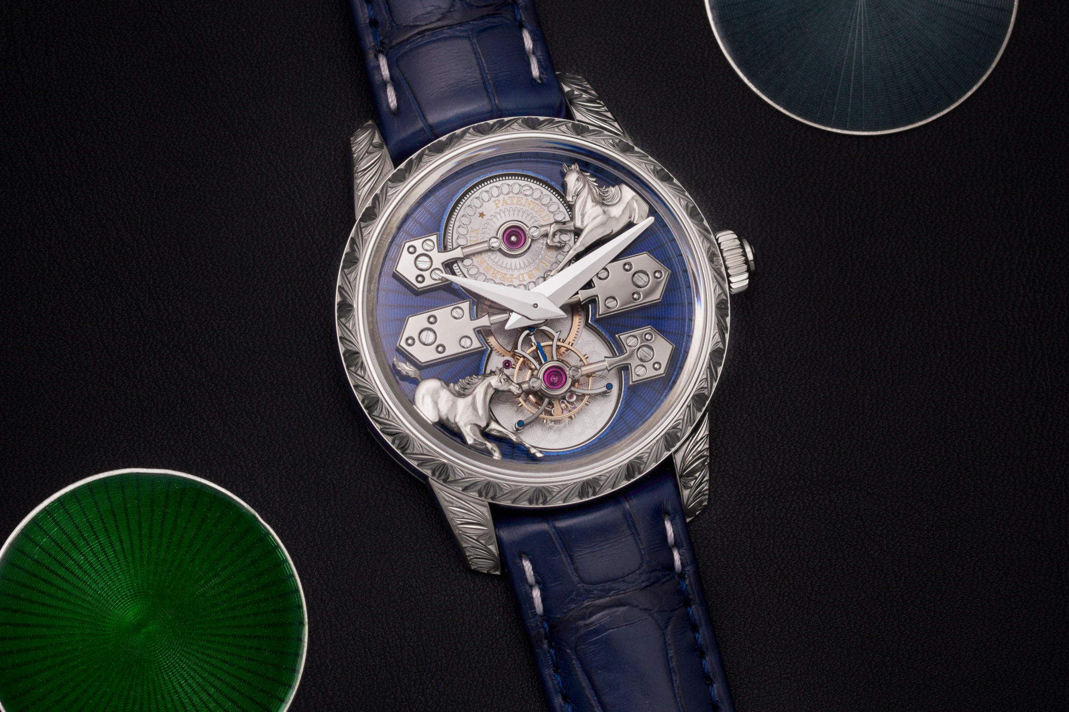 On the reverse side, the ‘secret’ hinged caseback is decorated with guilloché, and the white gold silhouettes of three horses are filled with blue enamel. With its fluted bezel, the caseback opens to reveal the in-house automatic GP09600-2083 movement with a white gold micro-rotor. Beating at 21,600vph, the movement delivers a minimum power reserve of 50 hours when fully wound.