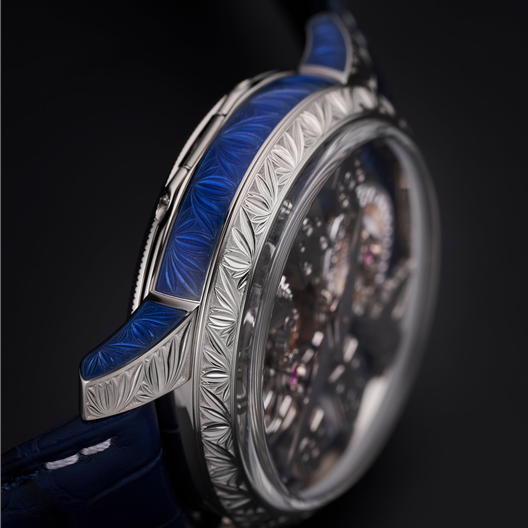 The spectacular guilloché dial with royal blue Grand Feu enamel hosts the hallmark gold arrow-shaped bridges with a surprising twist. The bridge over the top barrel and the bridge spanning the tourbillon features two hand-engraved white gold horses that reference the horses found on the caseback of the original La Esmeralda. As you would expect from such a high-end model, the bridges feature mirror-polished finishings.