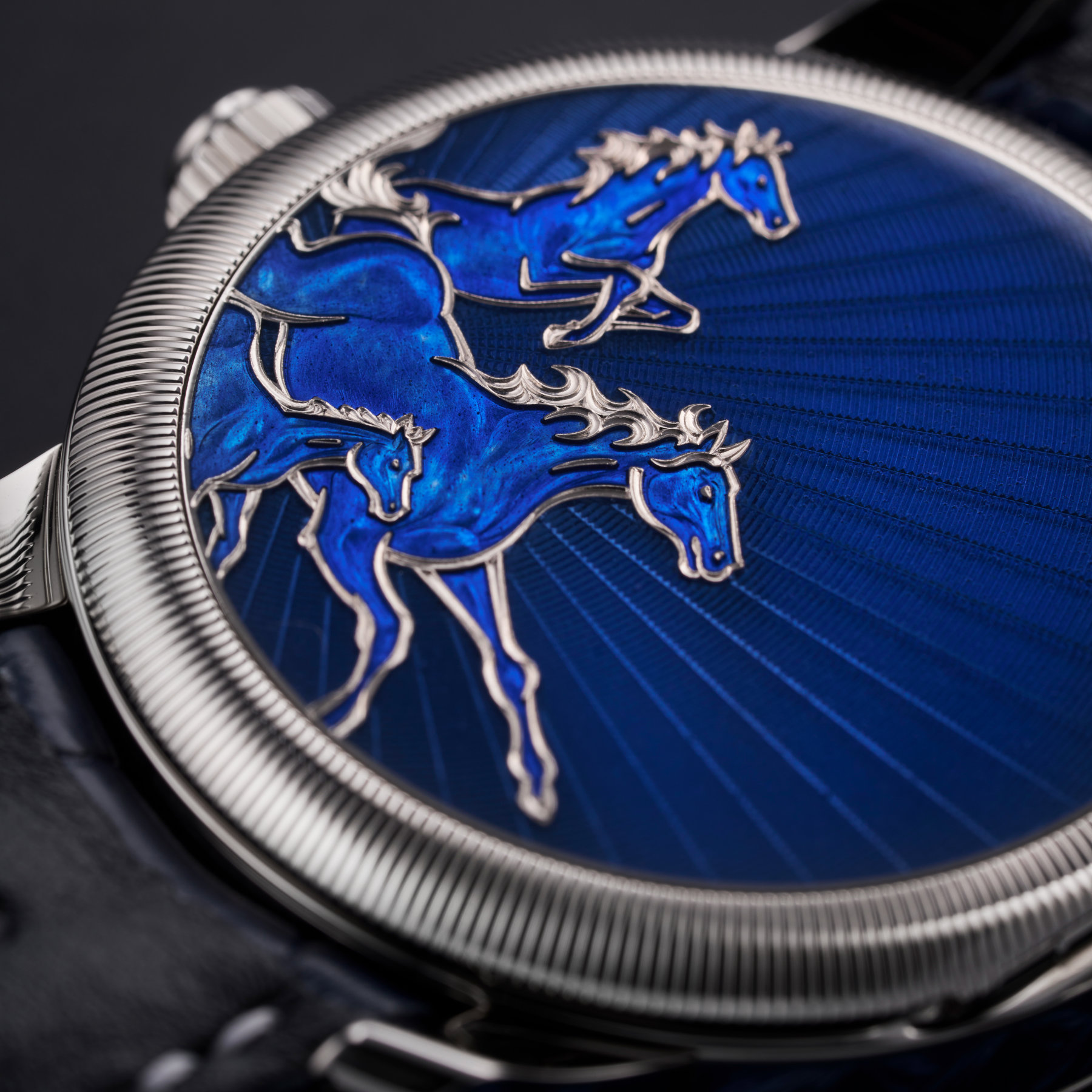 On the reverse side, the ‘secret’ hinged caseback is decorated with guilloché, and the white gold silhouettes of three horses are filled with blue enamel. With its fluted bezel, the caseback opens to reveal the in-house automatic GP09600-2083 movement with a white gold micro-rotor. Beating at 21,600vph, the movement delivers a minimum power reserve of 50 hours when fully wound.