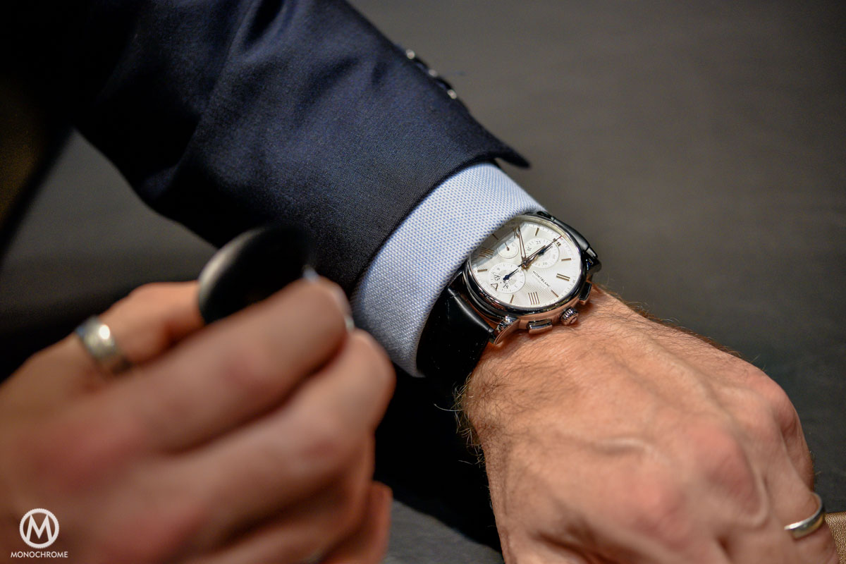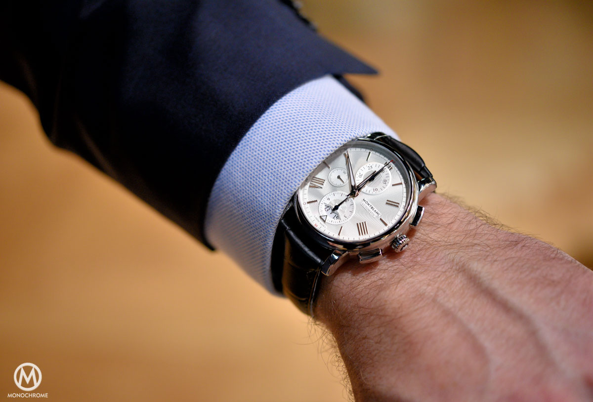 The Chronograph Automatic is powered by the self-winding MB 25.07 calibre, which is based on the Sellita SW500. This caliber features a 46-hour power reserve, central hours and minutes and a small seconds dial at 9 o’clock for keeping track of the time. The chrono functions are displayed in a minutes subdial at 12 o’clock (that registers up to 30 minutes), hours at 6 o’clock (up to 12) and central seconds. The date is displayed in an aperture in the subdial at 6 o’clock with a small triangle indicating the exact date.