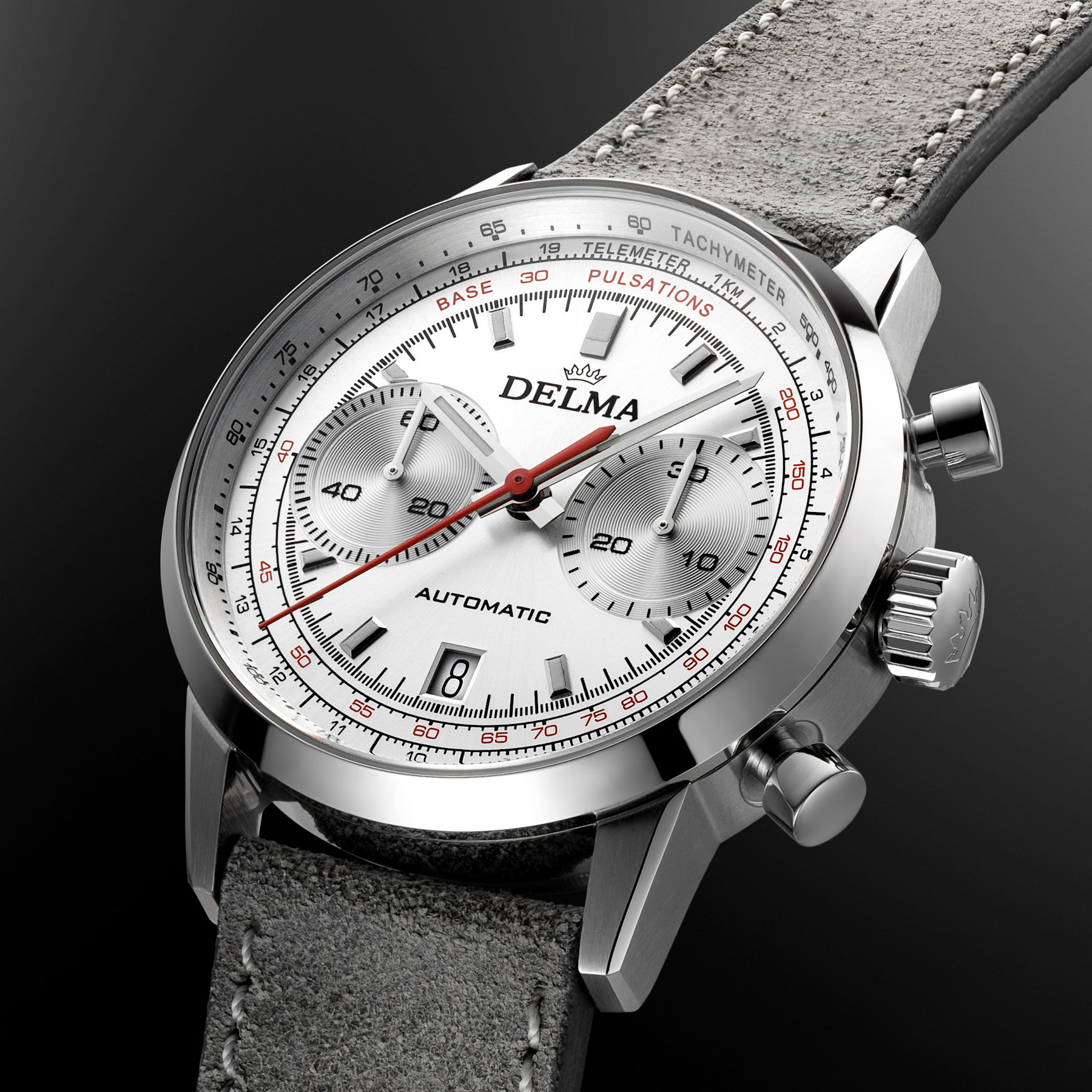 Delma is a family-owned brand based in Lengnau, Switzerland, with a solid track record of rugged sports watches adapted to racing, airborne and diving pursuits. The Continental Chronograph is a throwback to the brand’s rugged 1960s racing chronographs and has recently welcomed the Continental Pulsometer, a second, more elegant iteration with three scales and a monochrome bicompax dial in black or silver with racy red accents.