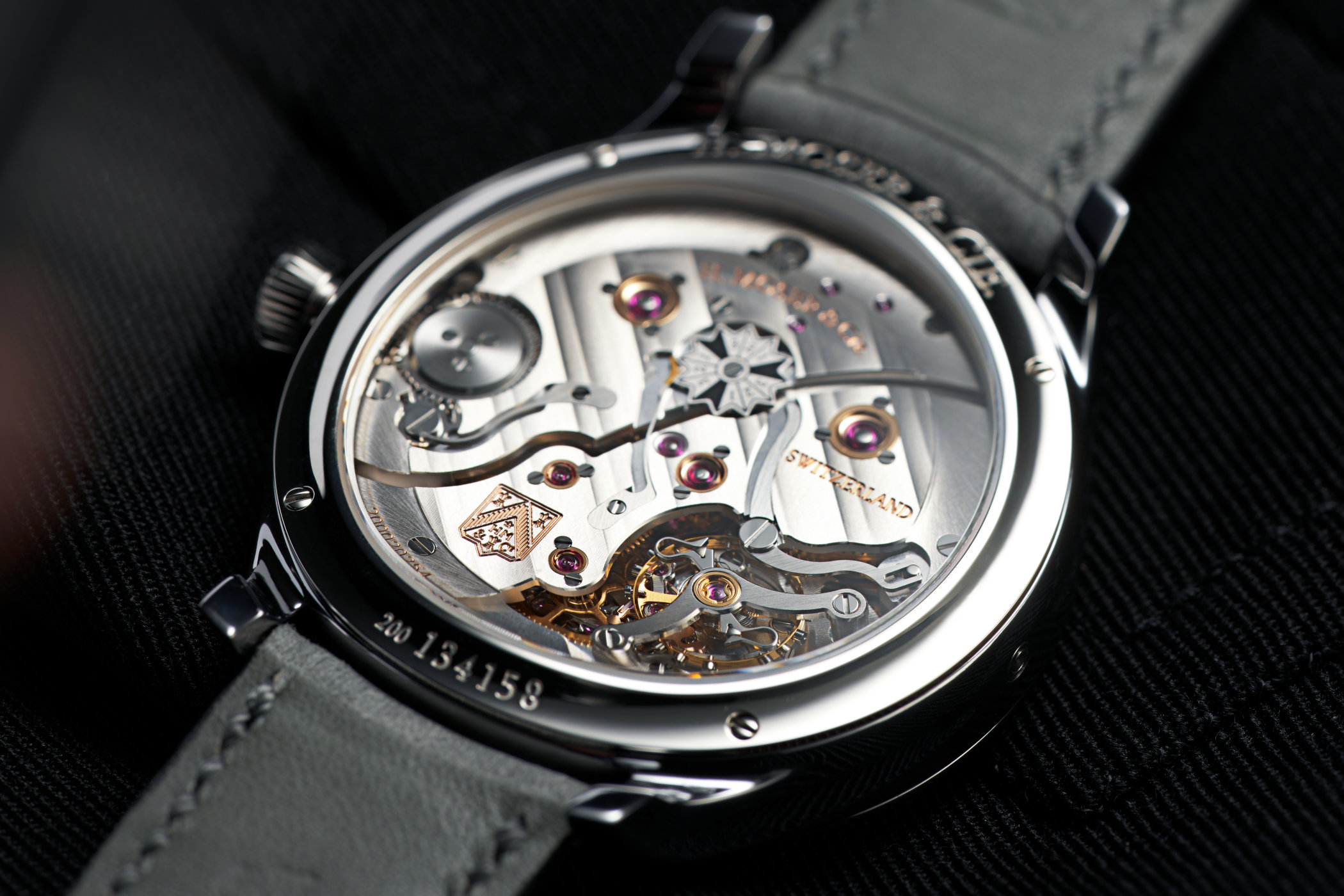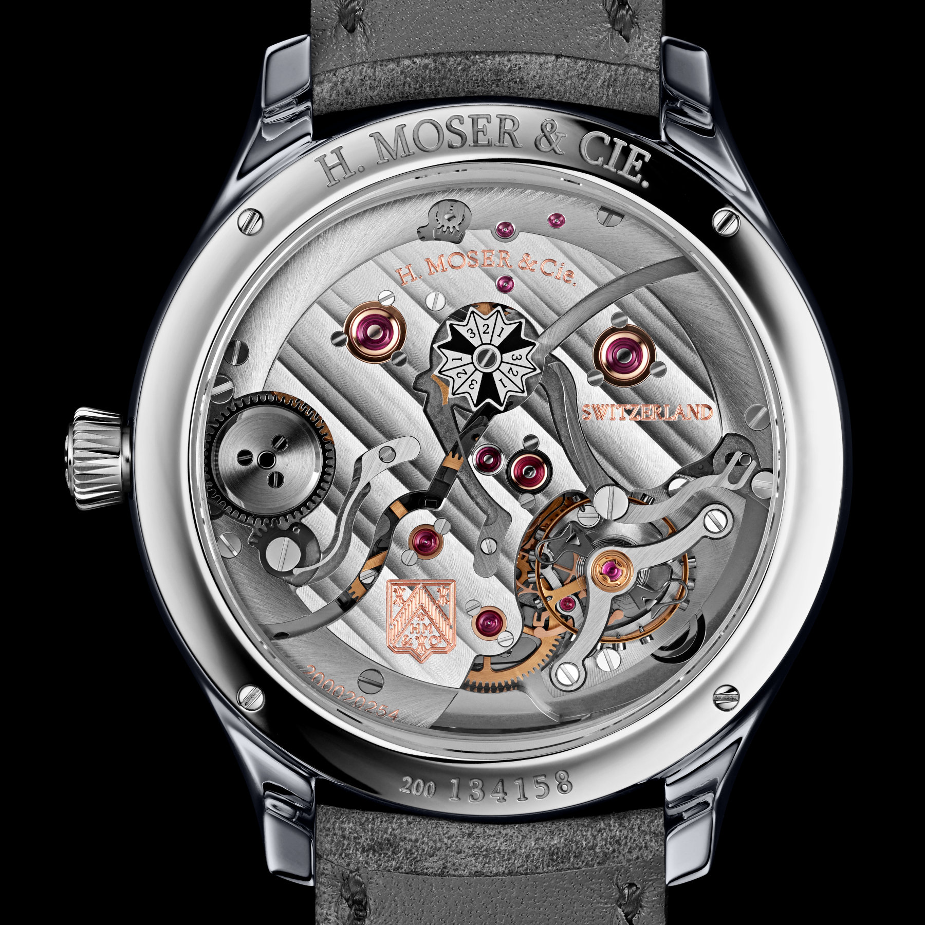 This stunning timepiece with immense appeal is also remarkable from a technical point of view. The hand-wound HMC 800 calibre, developed for H. Moser & Cie. by Andreas Strehler, allows the watch to be set using the crown any time of day or night. This movement has a double barrel that stores energy for a minimum of seven days. The calibre is hand-finished and decorated in Haute Horlogerie fashion; its pallet fork and escapement wheel are made from gold. The leap year indicator is movement-side, but you will be turning this watch over to admire the calibre more often than once in four years.