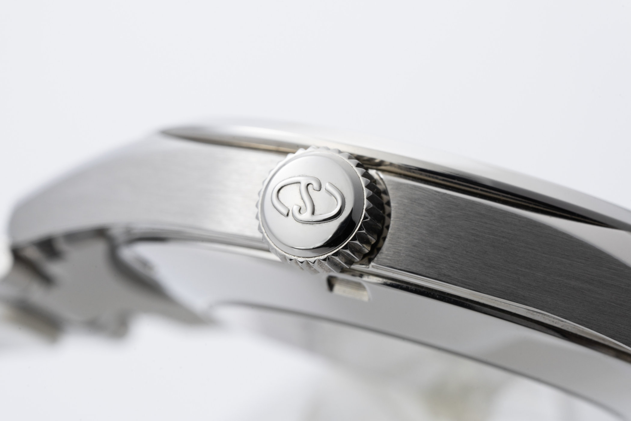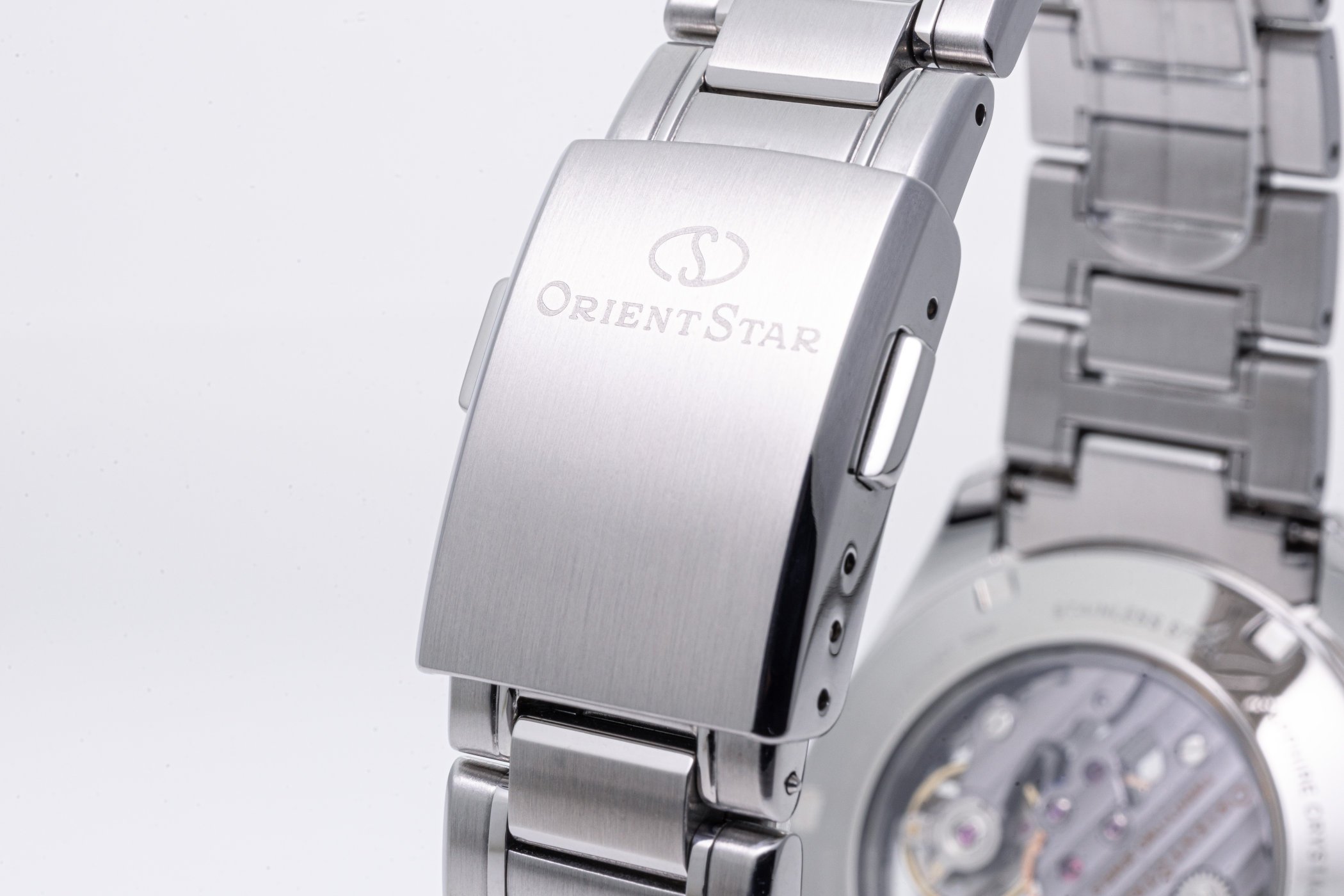 The stainless steel case is compact at 39mm in diameter and only 10.8mm in height, the latter thanks to the movement being hand-wound. Lug-to-lug is 46.5mm. It’s just slightly larger than last year (38.8mm x 10.6mm). A new 20mm steel bracelet works seamlessly with the piece and has short pitch H-shaped links that combine brushed and polished elements. Its trifold deployant buckle with a push button secures it to the wrist. A dual-curved sapphire crystal with Orient’s SAR (super anti-reflective) coating protects the dial, while the case back has a sapphire exhibition window. An oversized push/pull crown is easy to manipulate for winding and setting the time, but it limits water resistance to 50 metres.