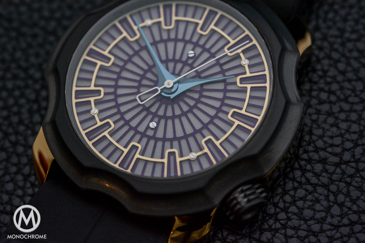 - Dial: two-part stainless steel, DLC, TiN (depending on the season), luminous teal, green, violet, or blue (in collaboration with James Thompson of Black Badger Advanced Composites), rhodium-plated hands (polished or matt blasted), (blued) steel seconds hand.