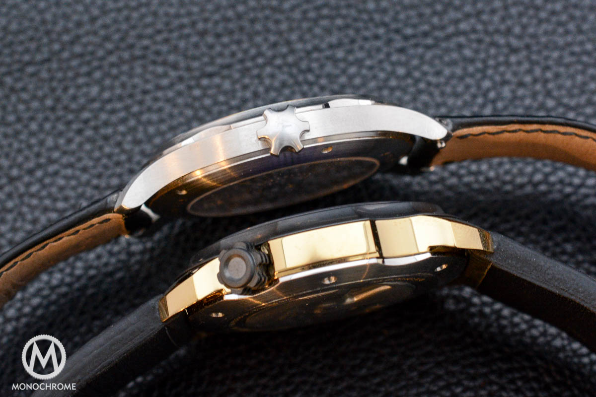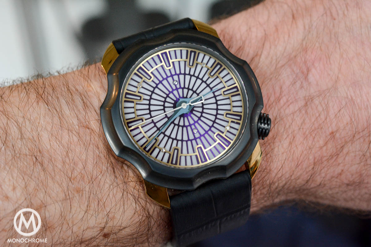 There’s the scalloped bezel that morphed from only a scalloped bezel, to a scalloped case design. There’s the three layer dial with double layer radial grid. All openings have been de-burred by hand, and slightly angled by hand as well. This has to be done with great care, as all angles must have exactly the same degree of angle. Otherwise the light will reflect rather uneven.