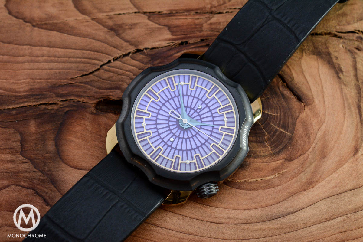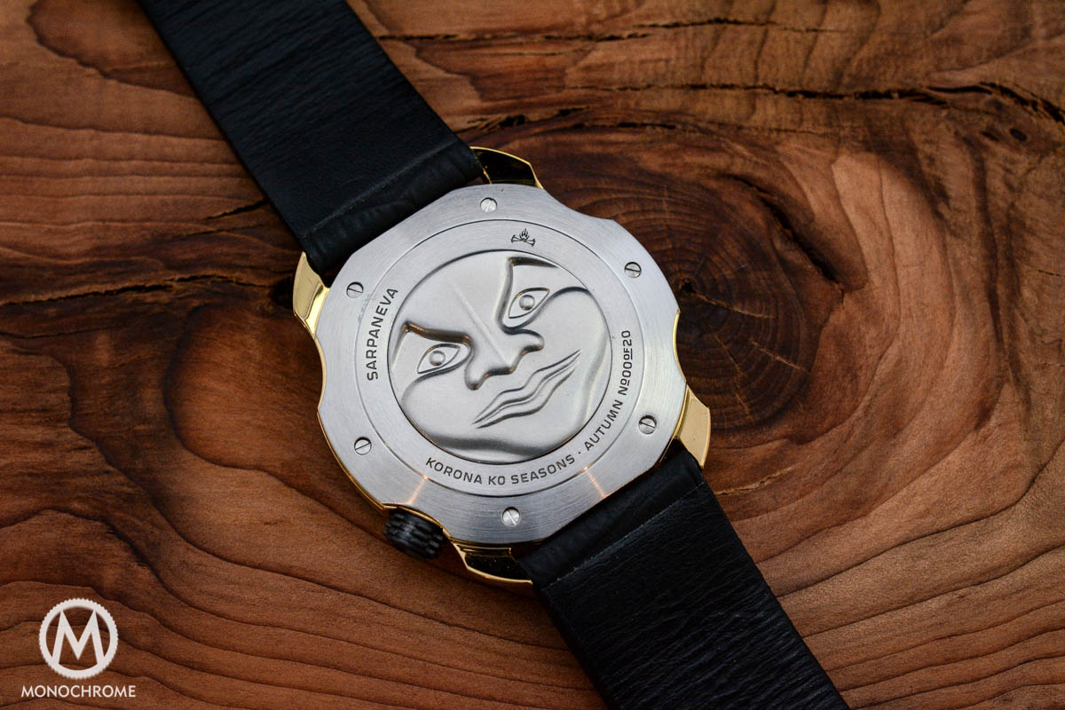 The stainless steel cases of the ‘Autumn’ version has been coated with TiN, which gives a yellow colour (almost yellow gold.) The scalloped bezel is black DLC coated, which gives a very good and sporty contrast with the yellow case. The case back is in plain stainless steel, and features Sarpaneva’s iconic angry/mysterious/curious (choice what you feel is most appropriate) moon phase. Sarpaneva’s name is engraved on one side around the moon, and the Black Badger sign is engraved on the other side, while “Korona K0 Seasons – Autumn No.00 of 20” below the moon.
